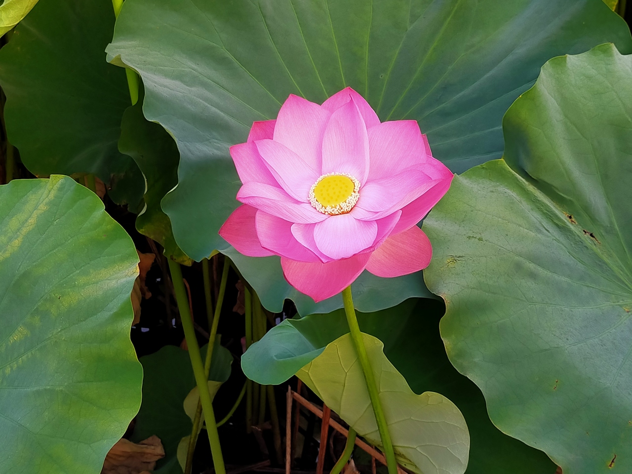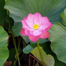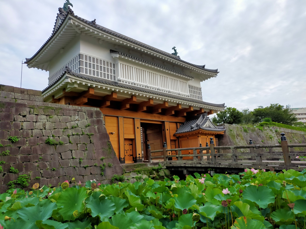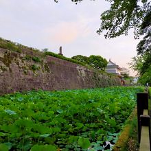 出来上がったばかりの門の両脇のお濠の蓮の花が見頃になっていました。