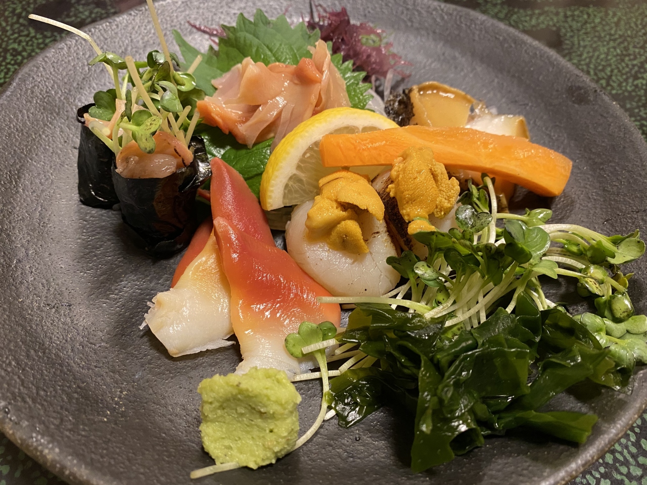 貝類のお造り盛り合わせは、赤貝、帆立の炙り、北寄貝の湯どうししたもの、蒸し鮑、ウニとなかなか豪勢ですが、1,400円なので、全て新鮮な生モノではありませんでしたが、まずまず満足でした。