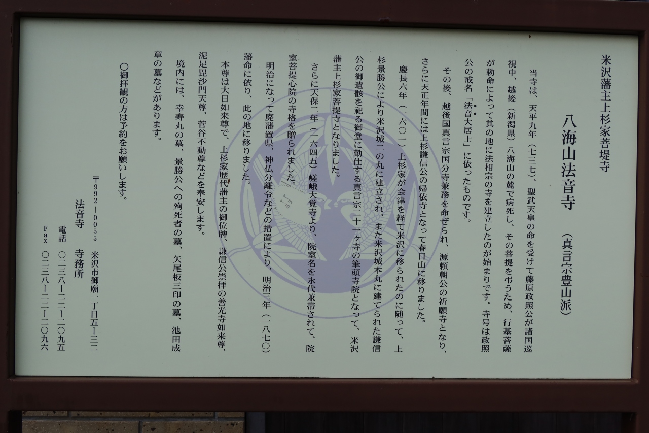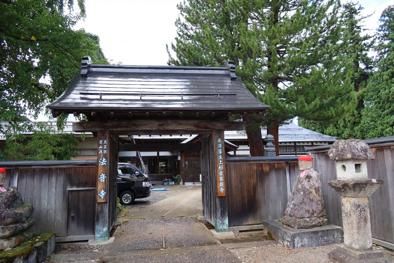 米沢の上杉神社から西に1km程のところにある米沢藩主上杉家廟所の入口前にある寺院が法音寺です。新潟六日町に天平9年に総建された寺院でしたが、慶長6年に上杉景勝が会津を経て米沢に移封され、米沢城内に移り、明治になり神仏分離令によって上杉家廟所前に移転しました。上杉家の菩提寺として上杉家にまつわる仏像が数多くあります。