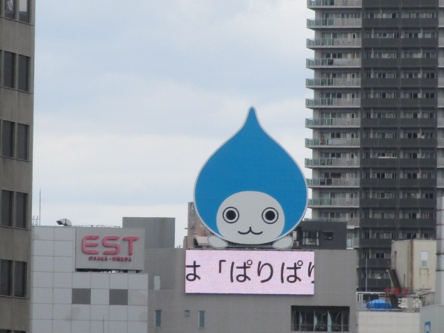 エストの横のビルの上にあります。ダイキン工業のゆるキャラです。大阪駅の3階の通路から綺麗に見えます。ぴちょんくんの下にはニュースが流れています。そして、この通路からだと、赤い観覧車も見えます。ちょっと異様な雰囲気のゆるキャラです。