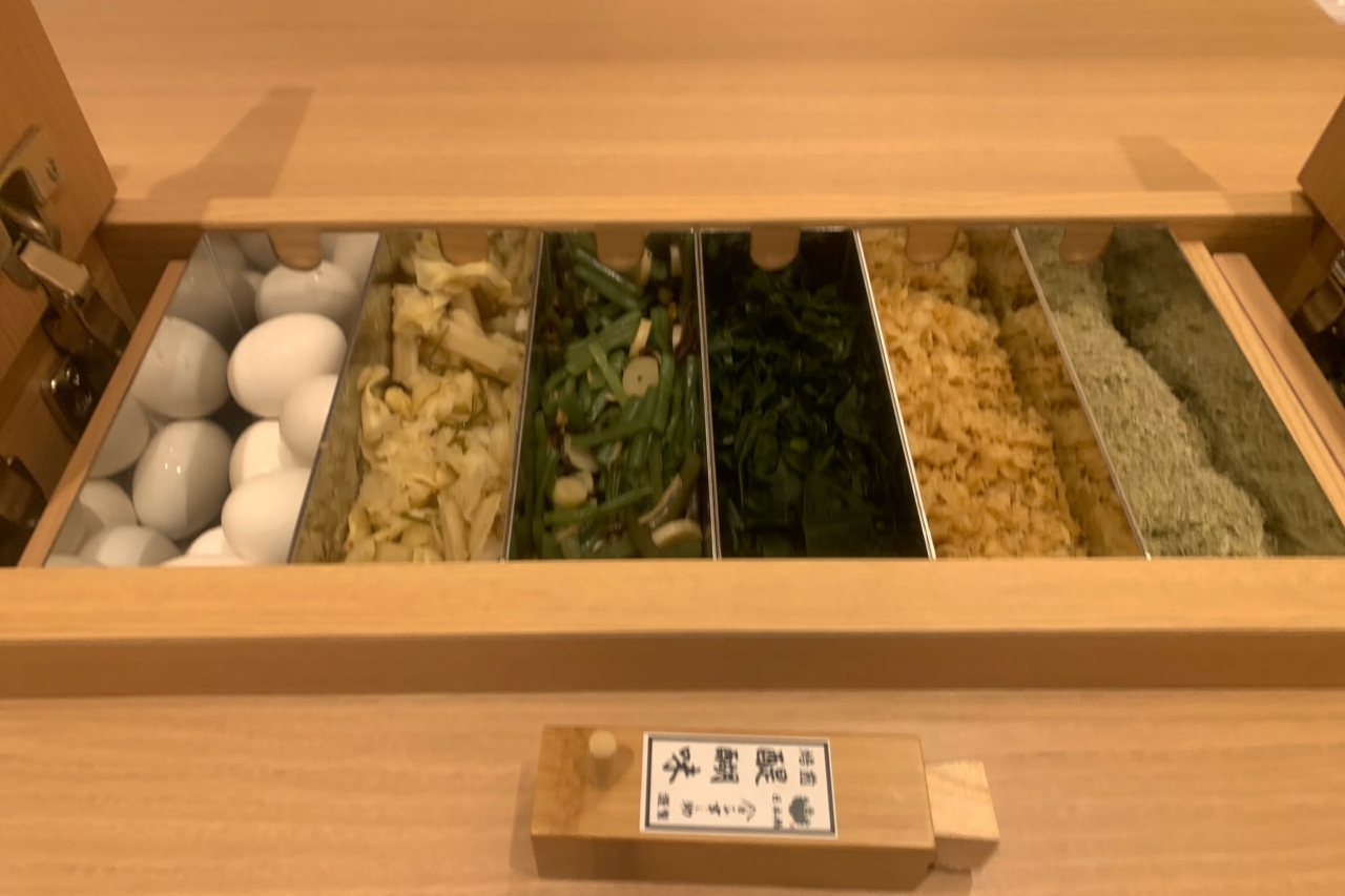 薬味や温泉卵が入れ放題というシステムが良いです。