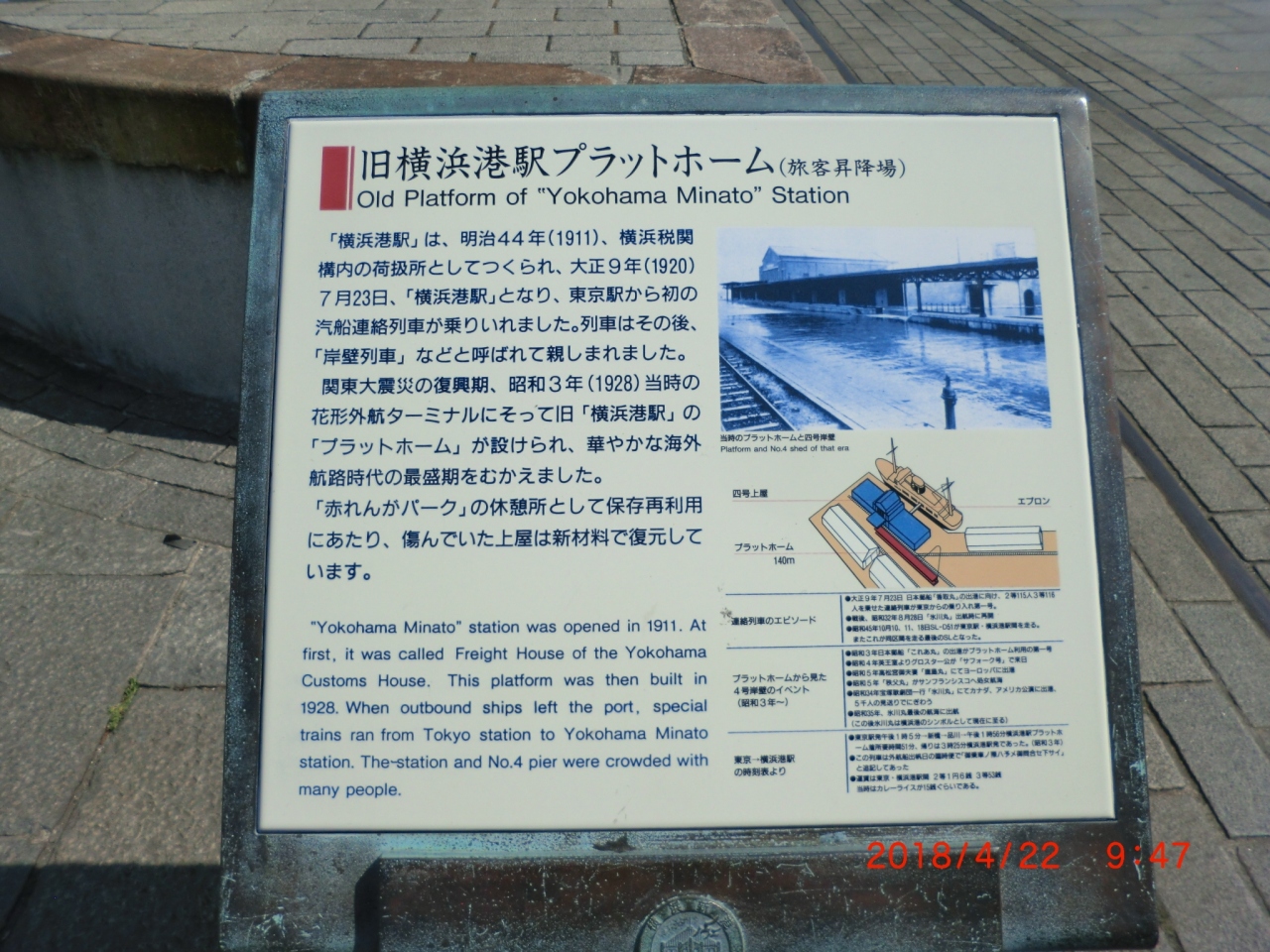 「山下公園」や「みなとみらい地区」には何十回も行ってましたが、今回初めて見つけました。ここは、横浜港から人や荷物を載せるターミナルだったようです。その後東京からの人や荷物を東京駅から横浜港まで船に乗る人や荷物を乗せるために、ここに停車場が出来たようです。昔の停車場の作りではなく近年の物で再現されてます。