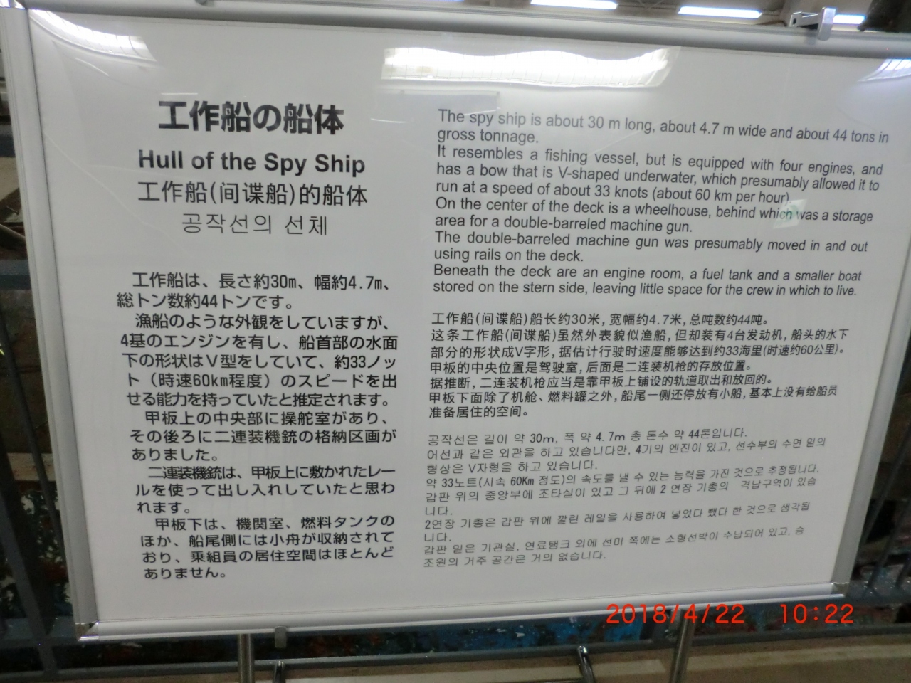 ここは赤レンガ倉庫の北側にあり、あるくこと5分の所にあります。ここには「工作船資料館」があり、20年前に九州南西海域(日本領)で北鮮の工作船が撃沈されました。その船を引き上げて、ここに展示してあります。北鮮の機銃で空いた穴だらけの船や銃器や備品や装備などが見れます。日本製の電気製品やロシア製??の銃などがありました。船体には無数の穴があり反撃されたことが分かります。横浜に行ったら足を延ばしてください。、