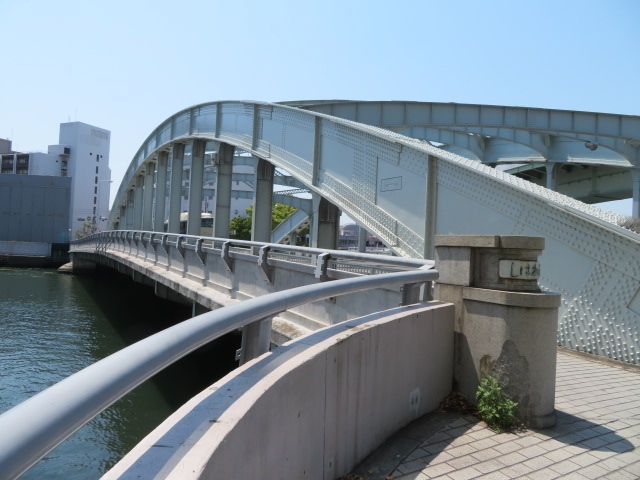 この橋は、中ノ島の突端の南側に架かる橋です。大きな橋なので、橋の入口の交差点には、「昭和橋西」の看板が掛かっています。アーチ型で交通量が多いですが、歩いても渡ることができます。コロナの影響下で、車も人も少なかったです。
