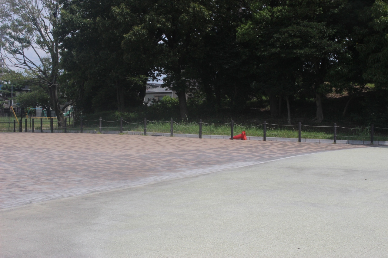 失われた「前方」部分や濠の部分は地面のタイルの色を変えて示していました。