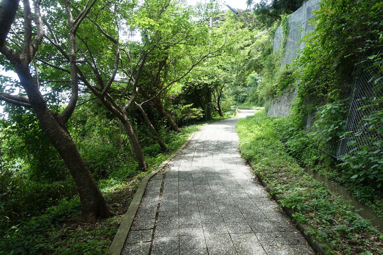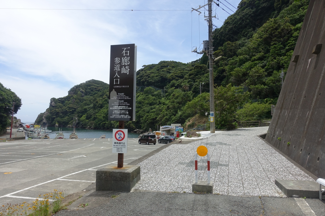駐車場から石廊崎までは遊歩道(石室神社参道)を歩いて片道20分とちょっと遠いです。参道は石畳のスロープ状で前半はひたすら上り坂。半分くらいまで来た所で工事をしていて、ここに駐車場ができれば歩く距離はだいぶ短くなるでしょう。トイレは漁港の駐車場の所と灯台手前の鳥居の脇にありました。いずれも無料。