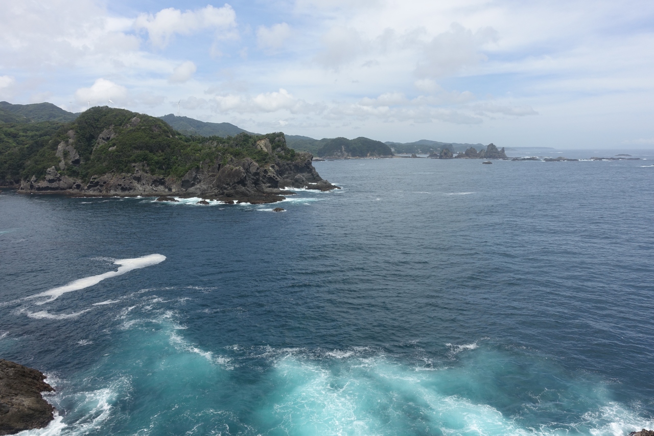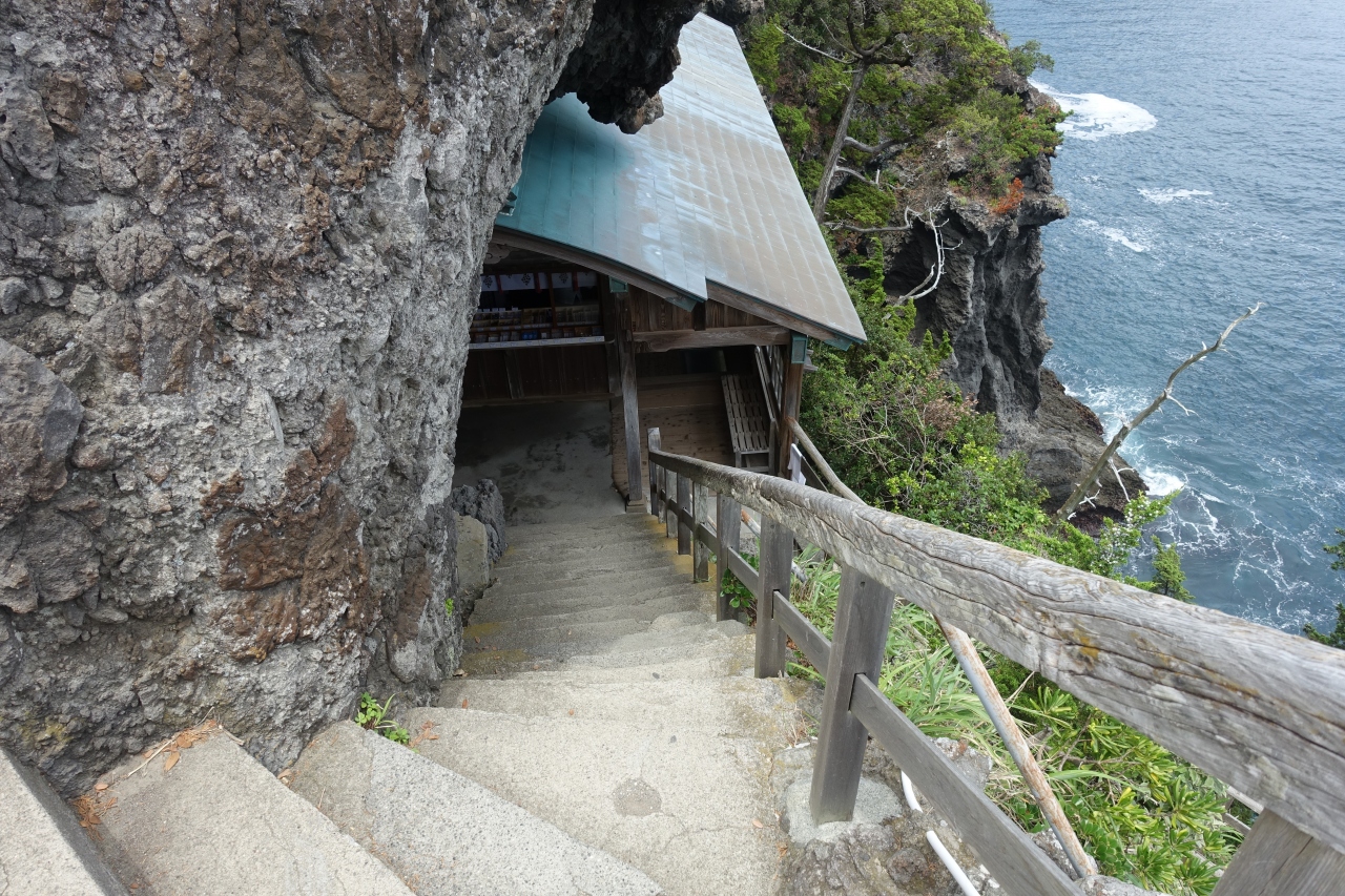 灯台を過ぎるといよいよ岬らしい景観が飛び込んできます。断崖絶壁に建つ石室神社とその先の熊野神社の祠まで歩いて行くことができ、海が広がるすばらしい景色を堪能できました。夏でもここではさすがに風が吹いていて爽快でした。