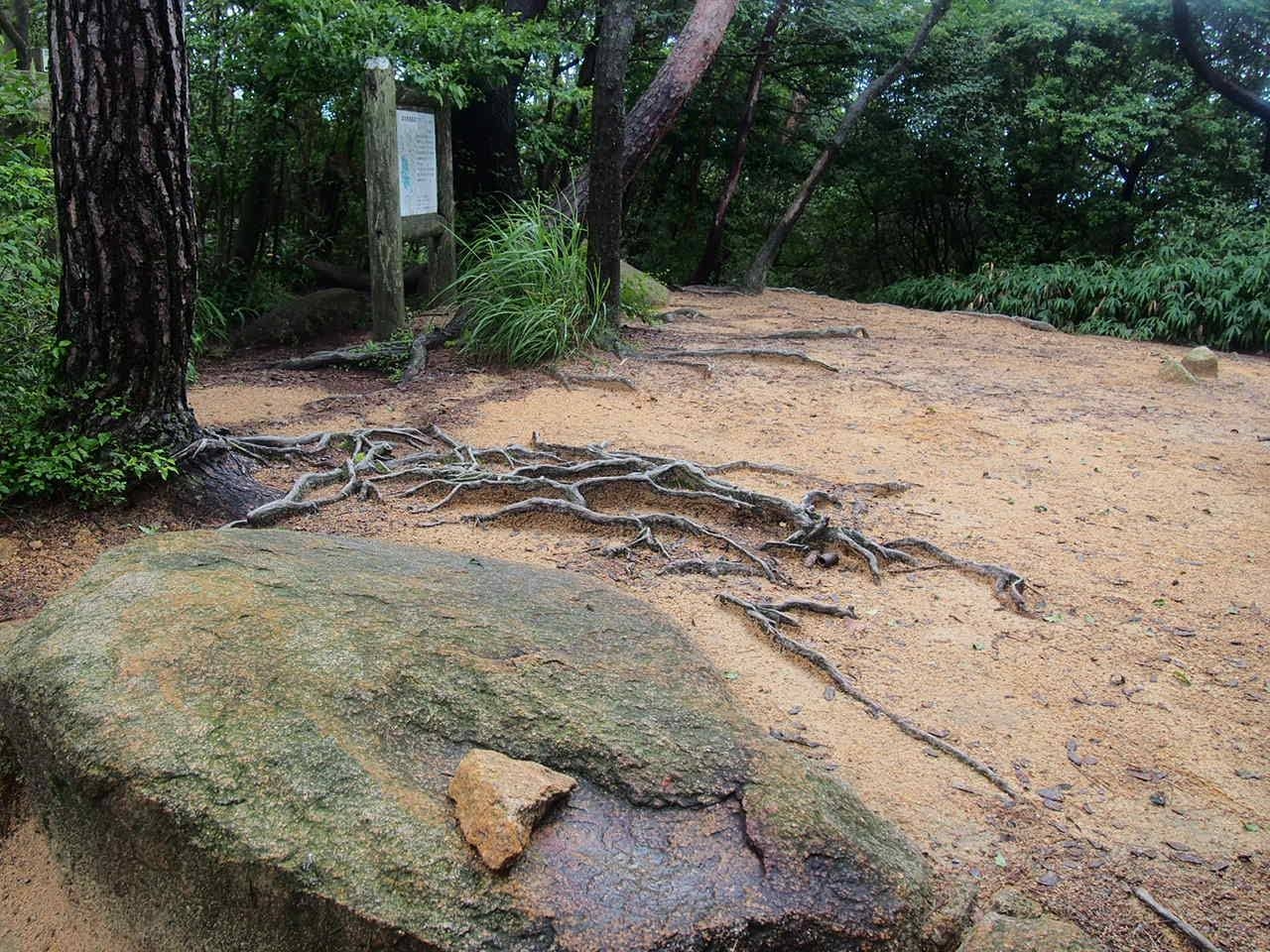 案内板はあったが特段、山頂という雰囲気もなく単なる空き地のようなたたずまい。特段景色が良いということもありませんでした。周辺は花崗岩の風化が激しくそのせいで荒れ地山というんですかねえ。