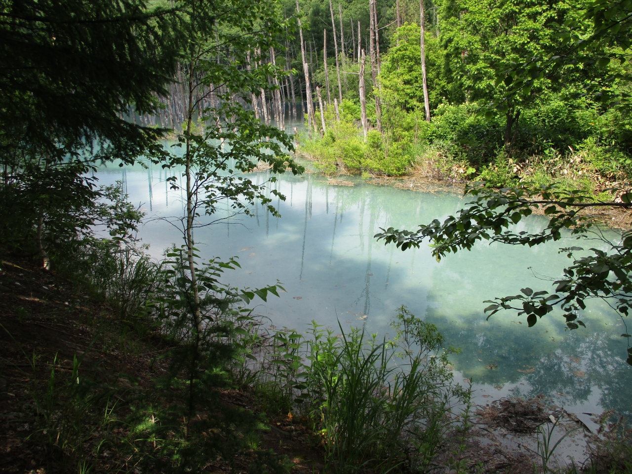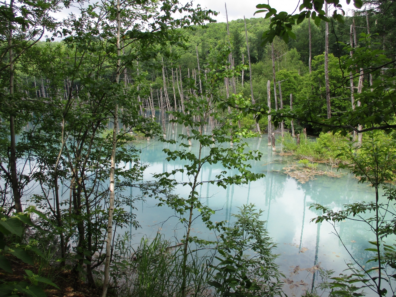 海の澄んだ青さとは違って白い絵の具を混ぜたようなきれいな水色でした。立ち枯れの木とあいまって不思議な景色でした。駐車場から少し距離があり5分程度で到着しました。7月上旬の週末に行きましたが、駐車場には結構車が止まっていました。