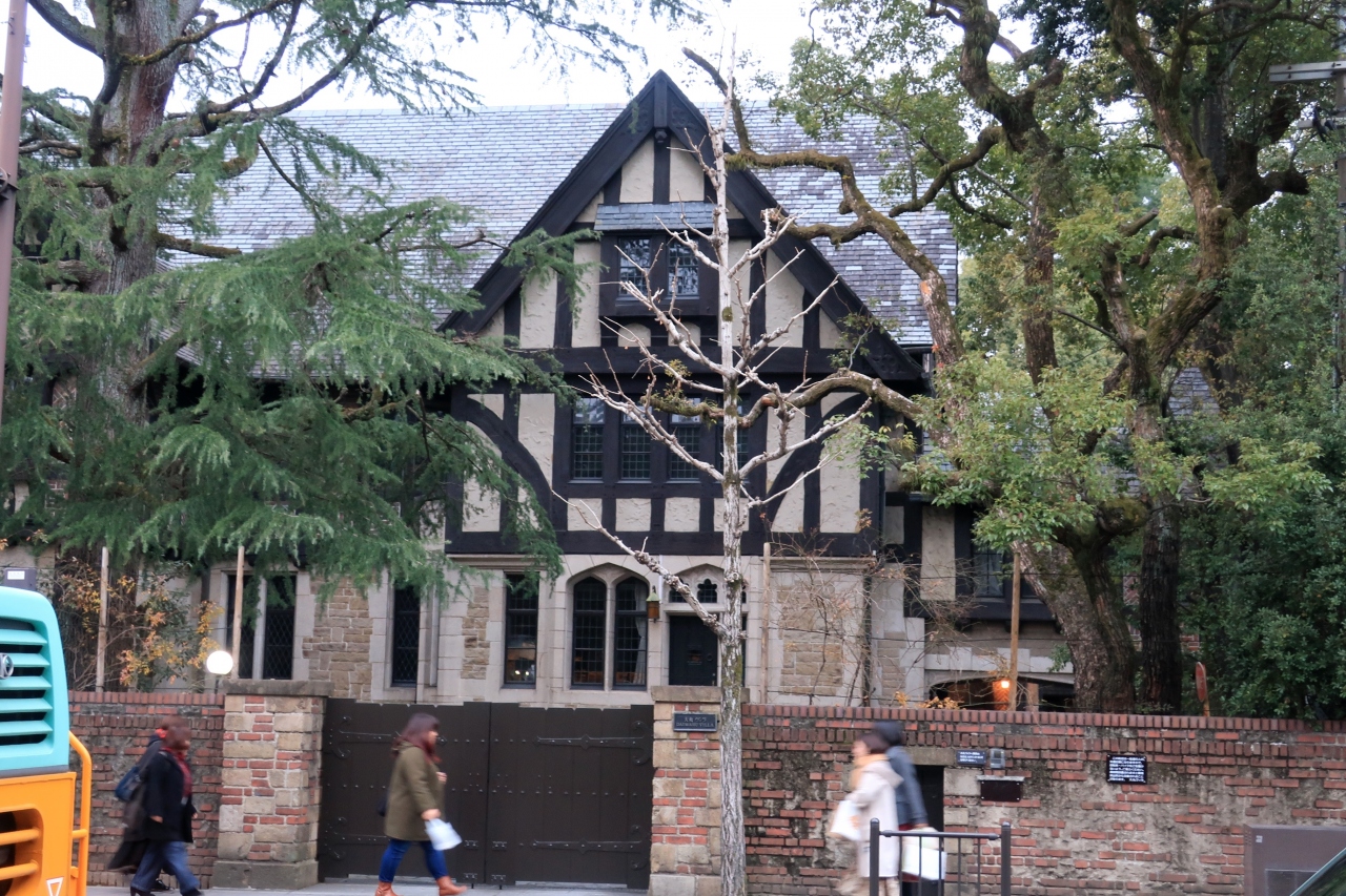 京都御苑の東側、地下鉄丸太町駅に近い烏丸通り沿いにこの建物はある。あるといっても非公開なので中を見たことがないが。百貨店の大丸の店主だった下村家の自宅として1934年に建築された。各地で名建築を残しているヴォーリズ建築事務所の設計だ。急勾配の瓦屋根に煉瓦の煙突、構造材をデザイン的にむき出しにするイギリスのチューダー様式でまとめられているところから中道軒と名づけられたという。京都市登録有形文化財。