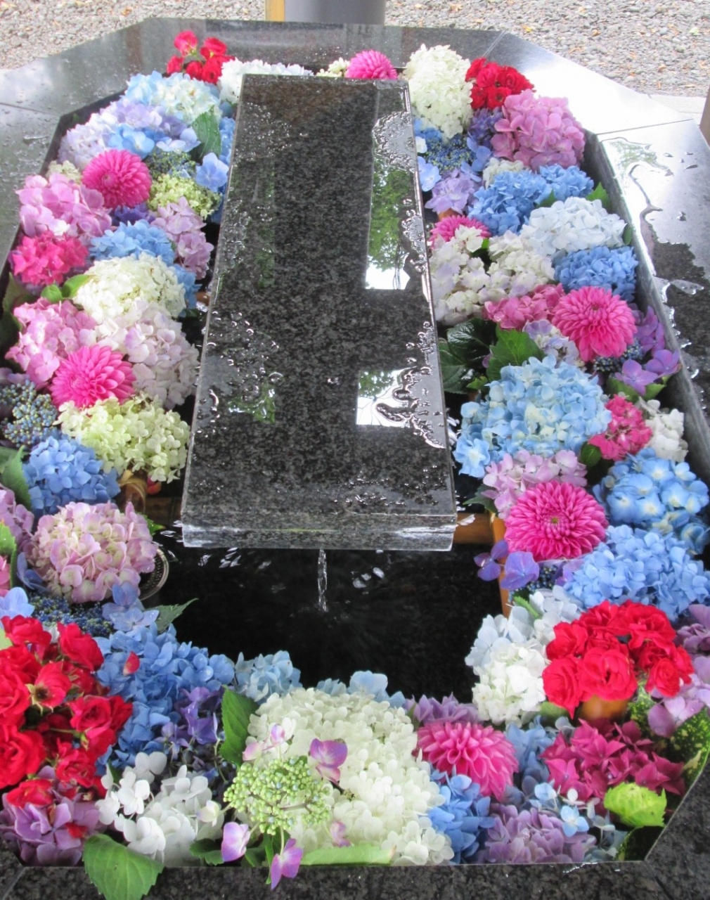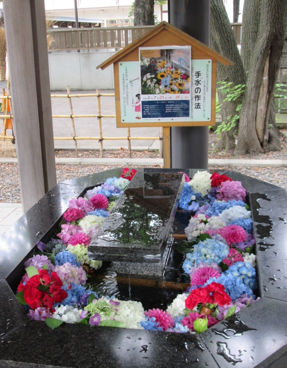 花手水の記事があり行ってみましたが、手水鉢にきれいな花が溢れていて見応えがあり、家族連れなど次々と来ていました。