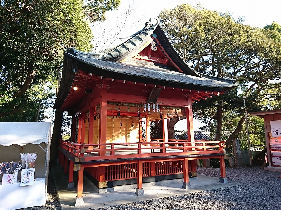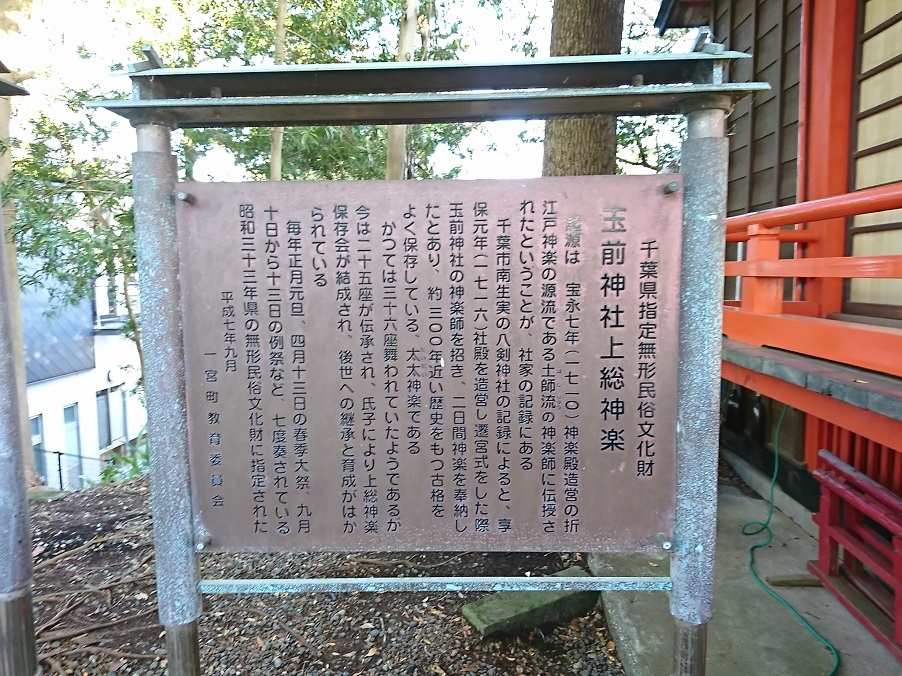 千葉県一宮町に鎮座している玉前神社の本殿前に神楽殿があります。300年以上の歴史が有り、鮮やかな朱色の外観で、本殿よりも目立っていました。千葉県の無形民俗文化財に指定されている上総神楽が行われる神楽殿です。玉前神社参拝の際には神楽殿への訪問もお忘れなく!