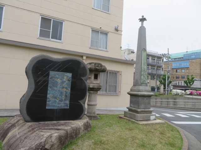 読めませんでしたが、右近に対する思いを読んだものでしょう。教会の石碑ということで、ちょっとおしゃれな石碑で、この文字の書いてあるのは青銅板です。ユニークな石碑です。