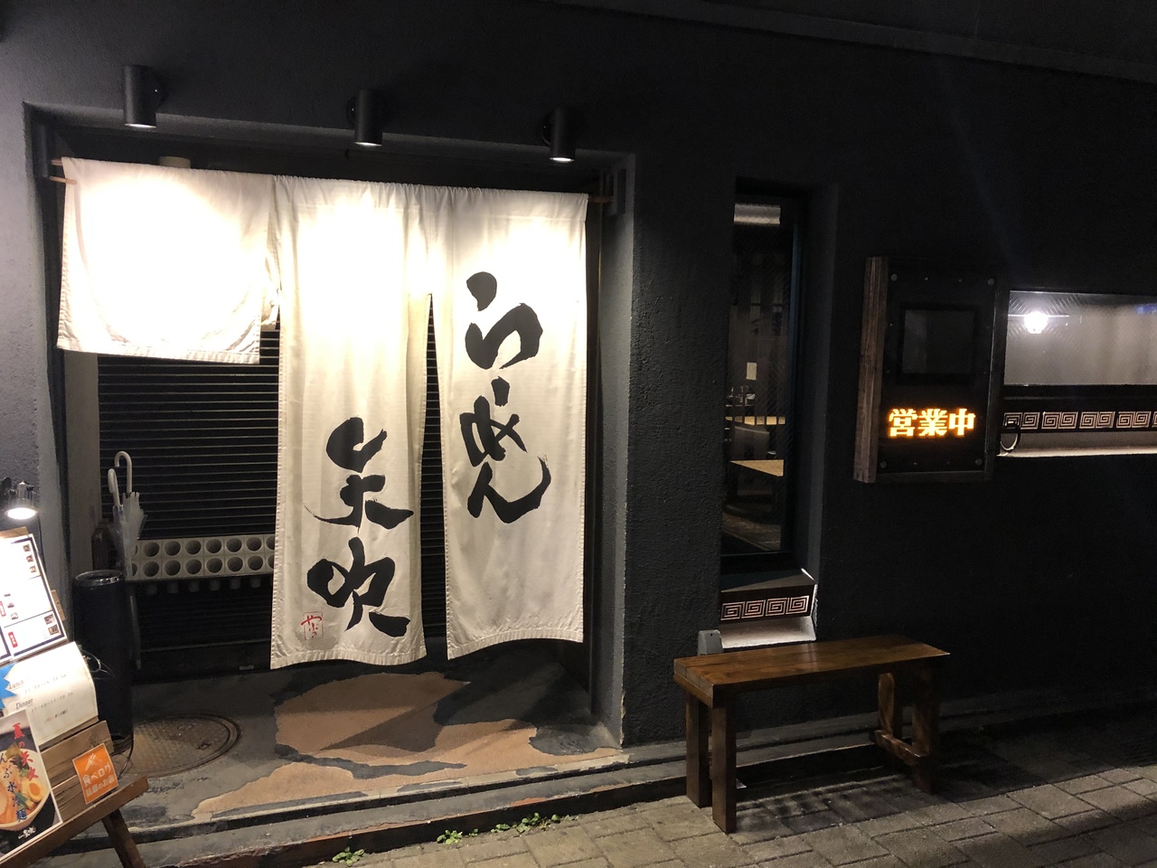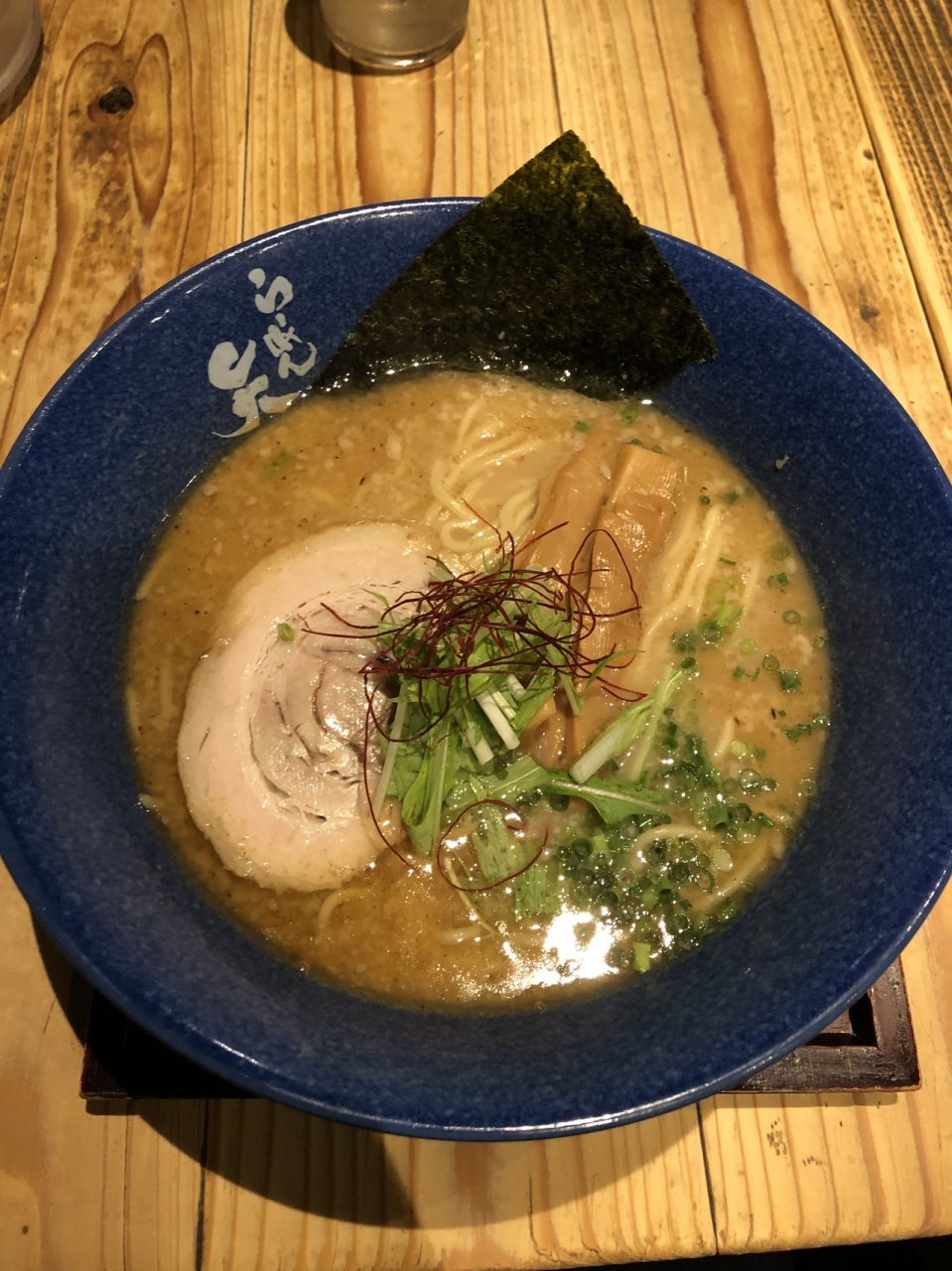 静岡駅周辺で物足りないと思った時はこの店に行くべき!海戦の出汁が効いた塩ラーメンを注文した。外観はおしゃれな和食屋のような暖簾と薄暗い雰囲気。店内はカウンターのみならずテーブル席もいくつか設けられていて寛ぐことができる。