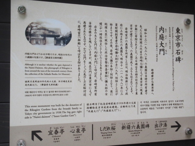 東京の名園である六義園に行きました。その園内に入る門(正門)のところ、すぐに石碑がありました。四角い大きな石碑です。植え込みっぽいところにあるので少しわかりにくいけど、説明板もありました。東京に庭園が寄付されたことが書かれているそうです。寄付ってすごいですよね。