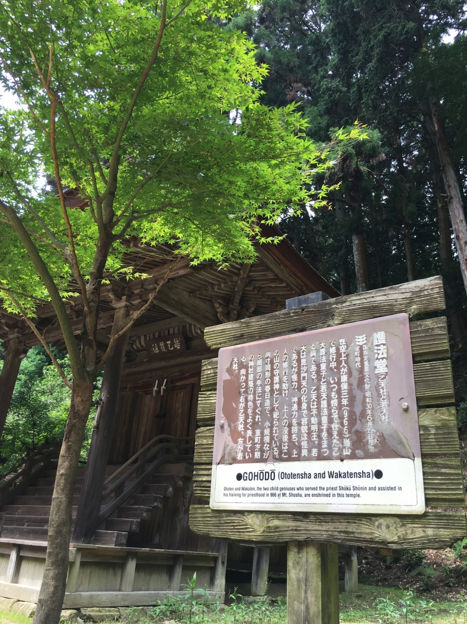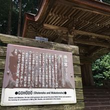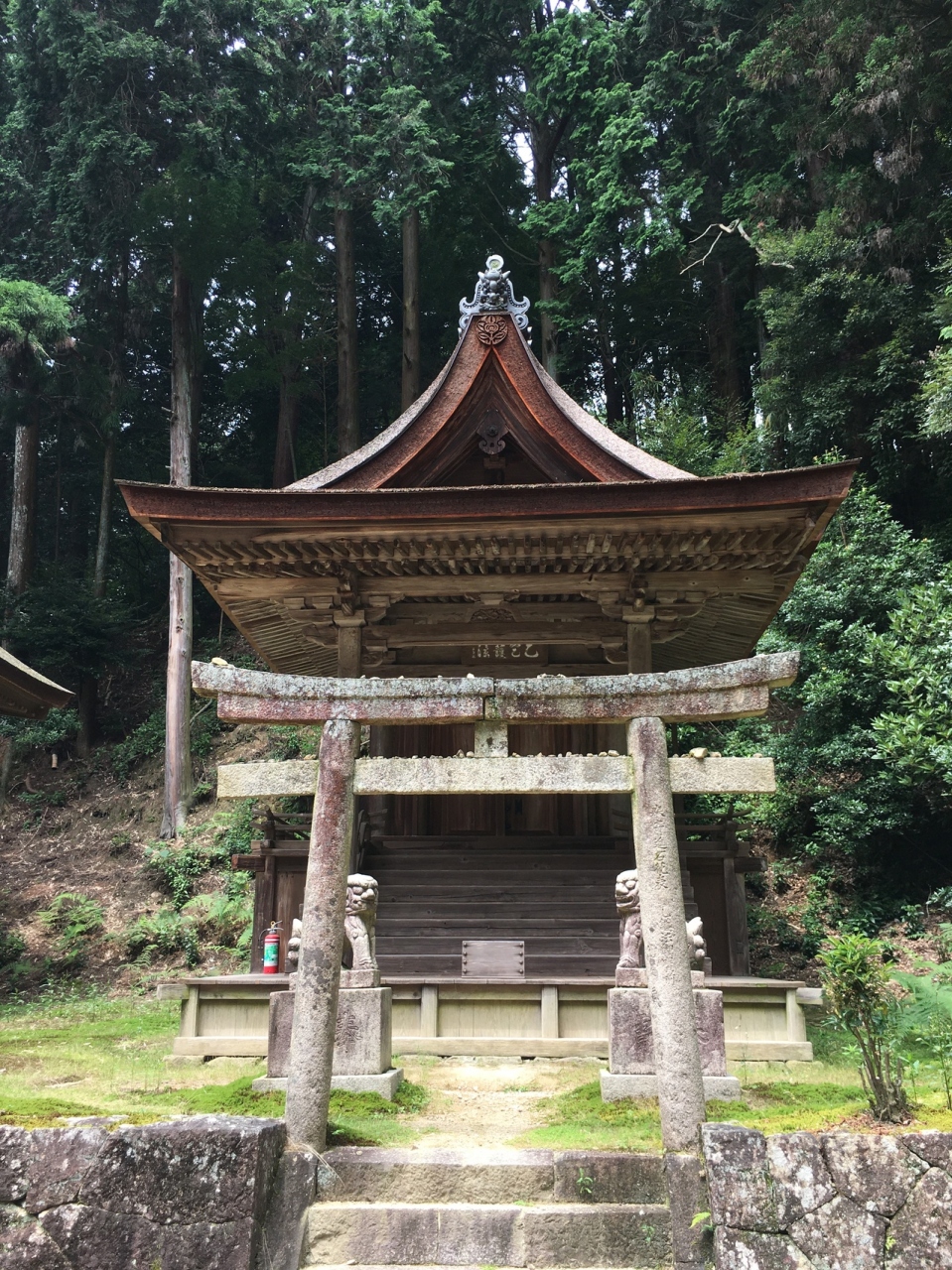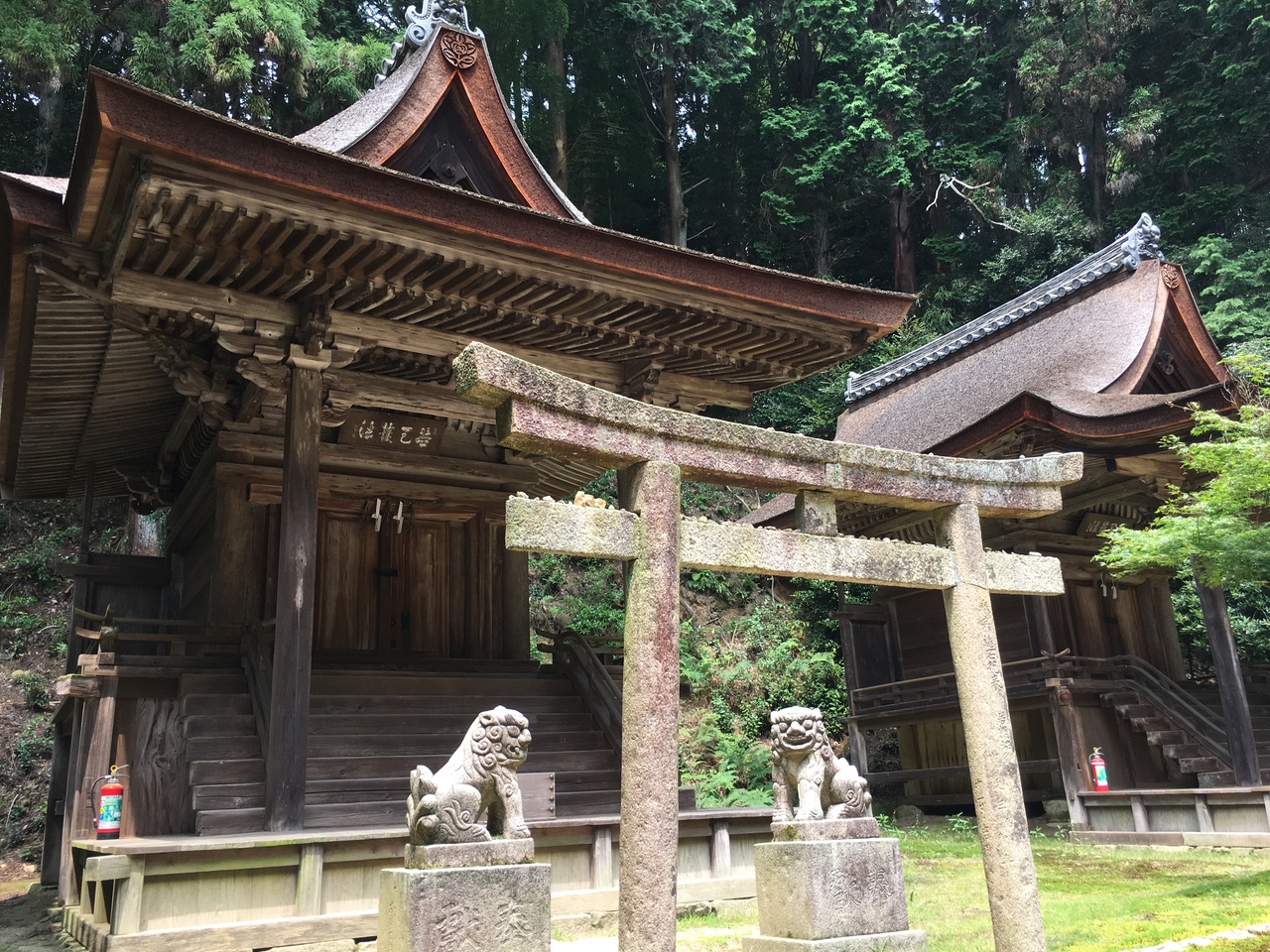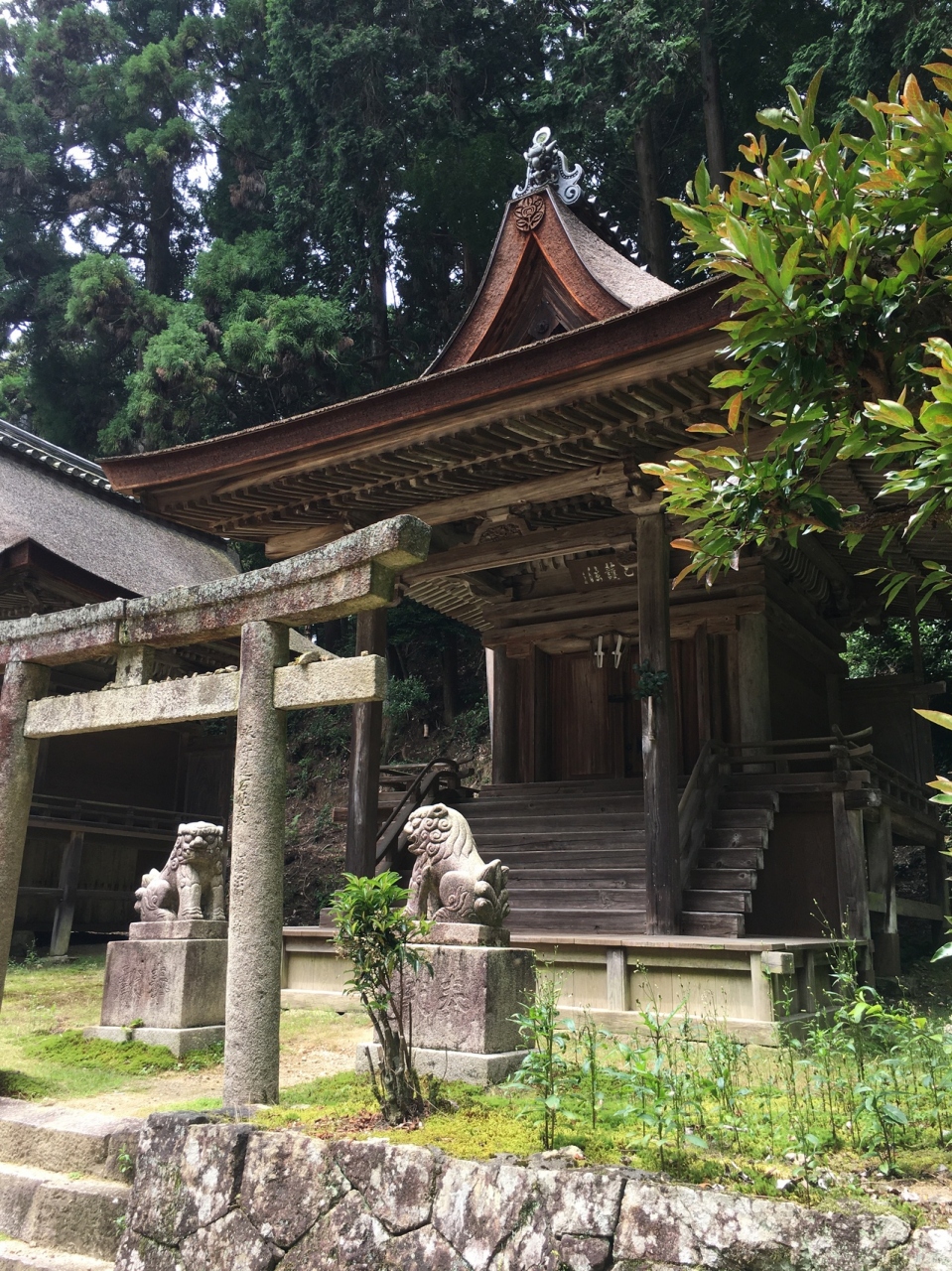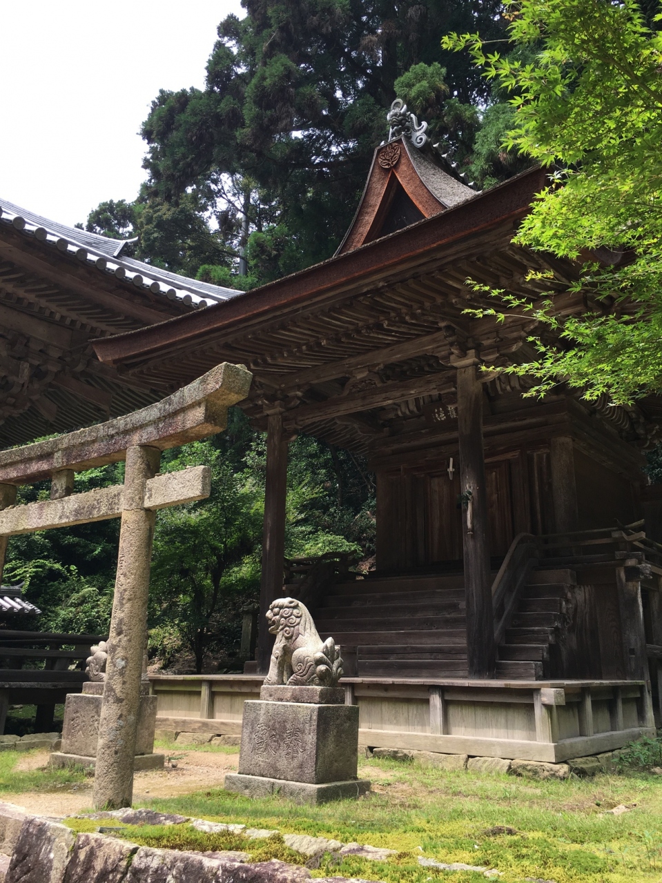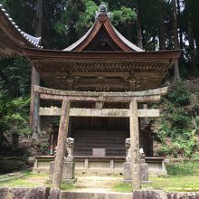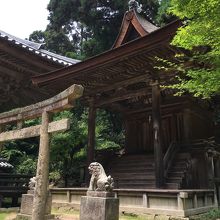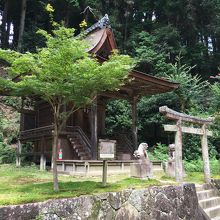 鳥居があり、潜ると直ぐに左右に獅子の像があって、笑っているような表情でした。かなり年季が入ったような建物で正面には扉がありましたが閉まっていました。後方には木々が茂っているのが建物を良い雰囲気に醸し出していました。