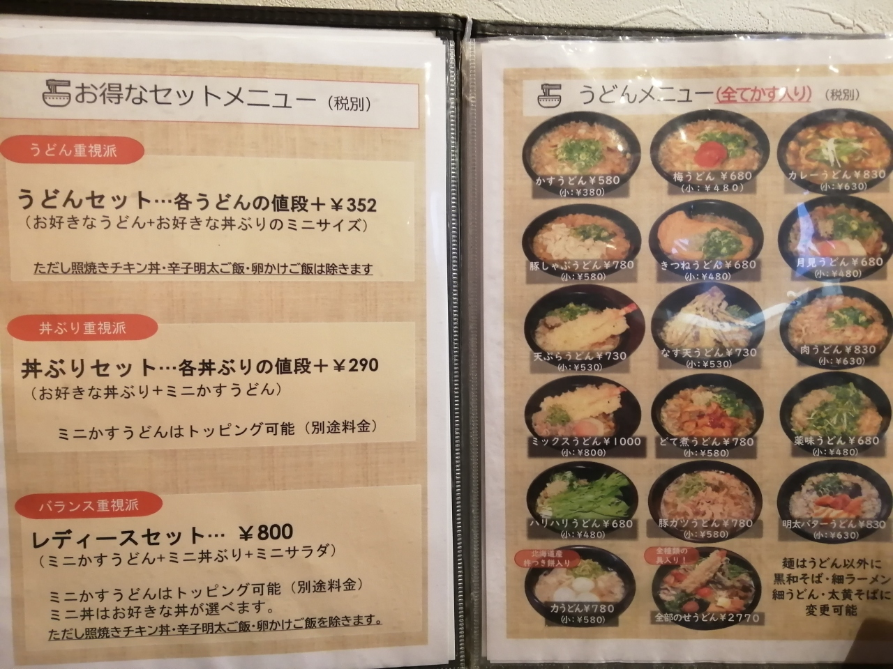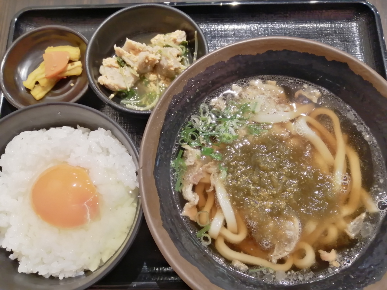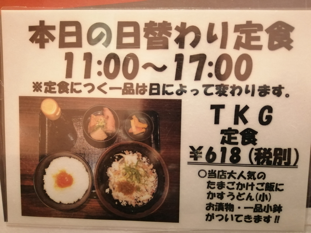 平日のみのランチ618円は日替わりで、訪れた日はかすうどんに卵かけご飯と小鉢・漬物のセットでした。