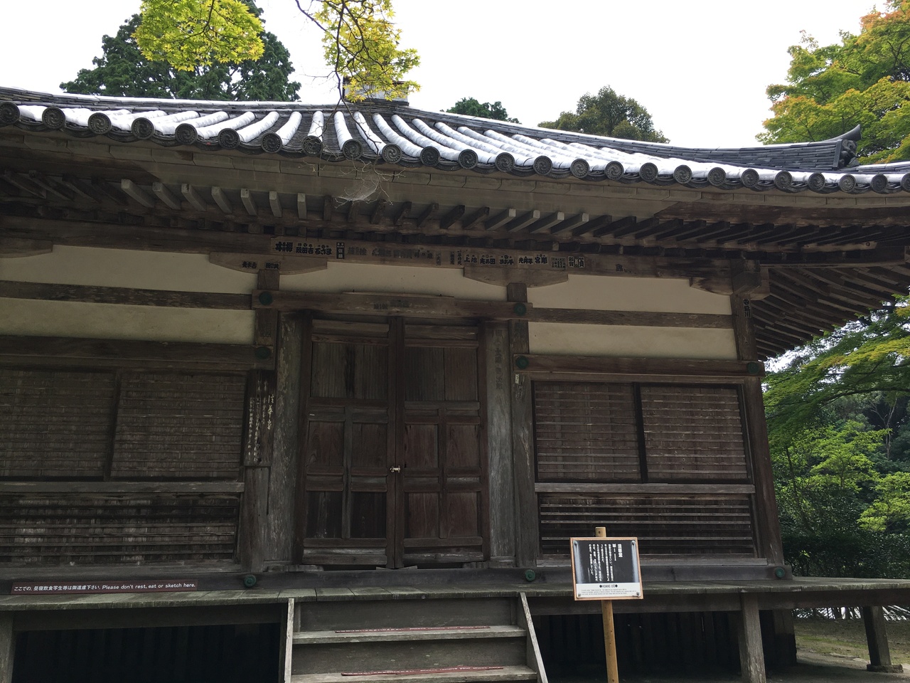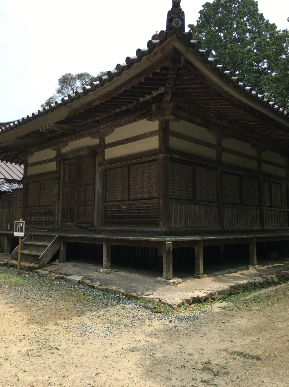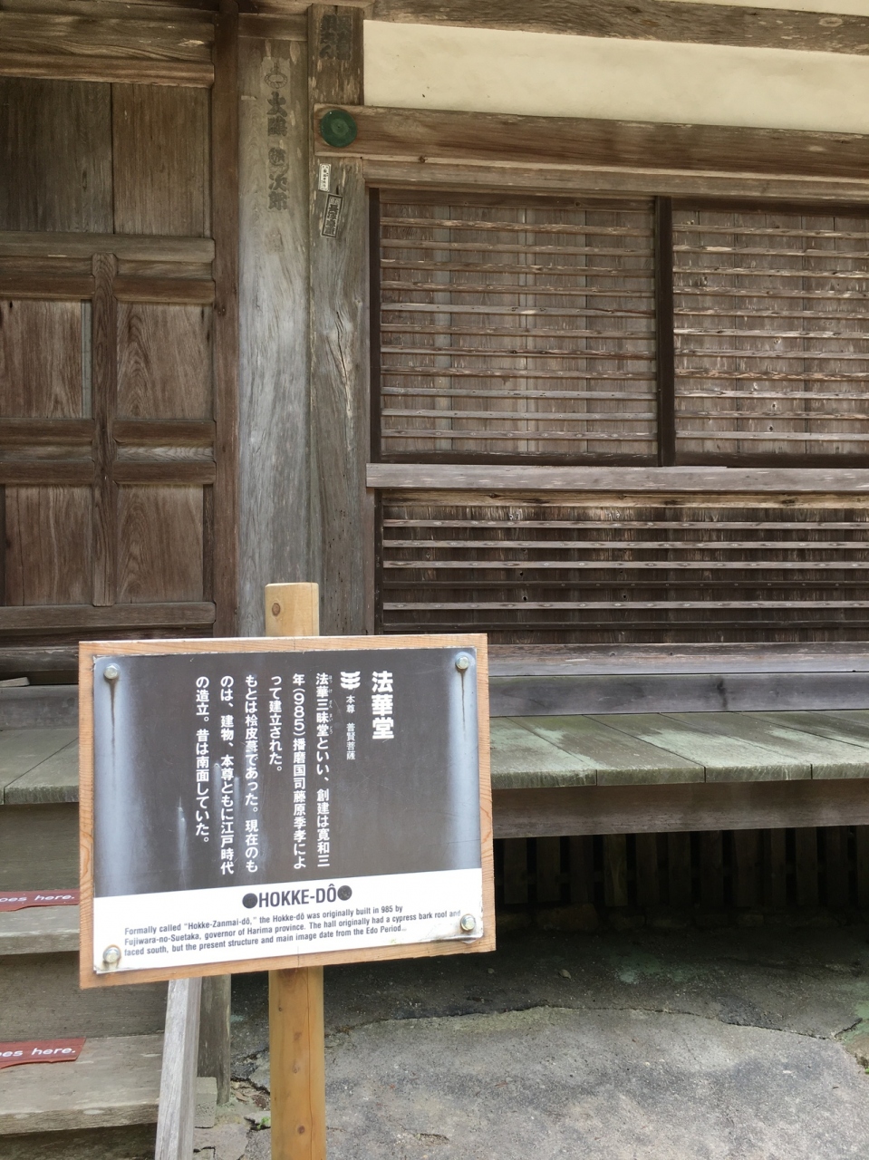 創建は985年とはるか昔で、現在の建っているものは江戸時代のものです。中には普賢菩薩があるようですが扉が閉まり見れませんでした。柱で支えた高床式の建物で、縁側もあり情緒ある建物で横に引く扉が多い建物でした。