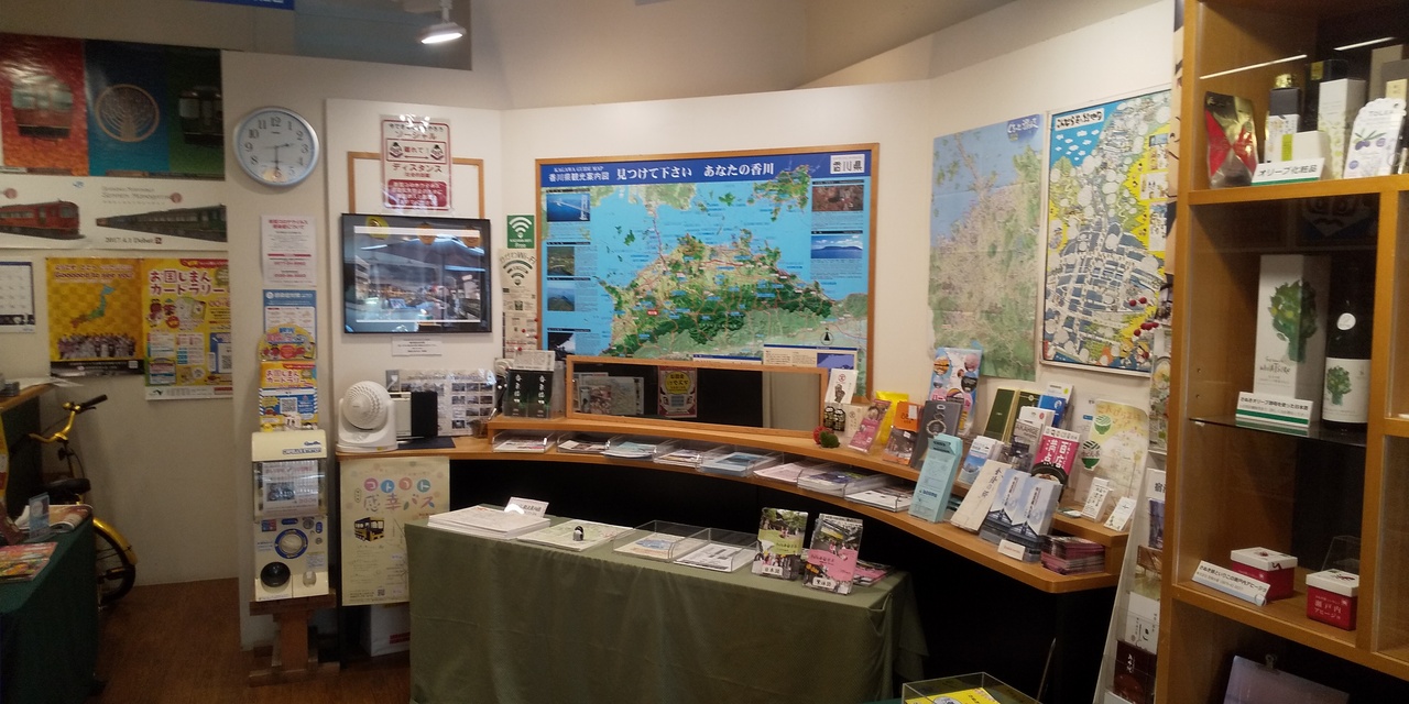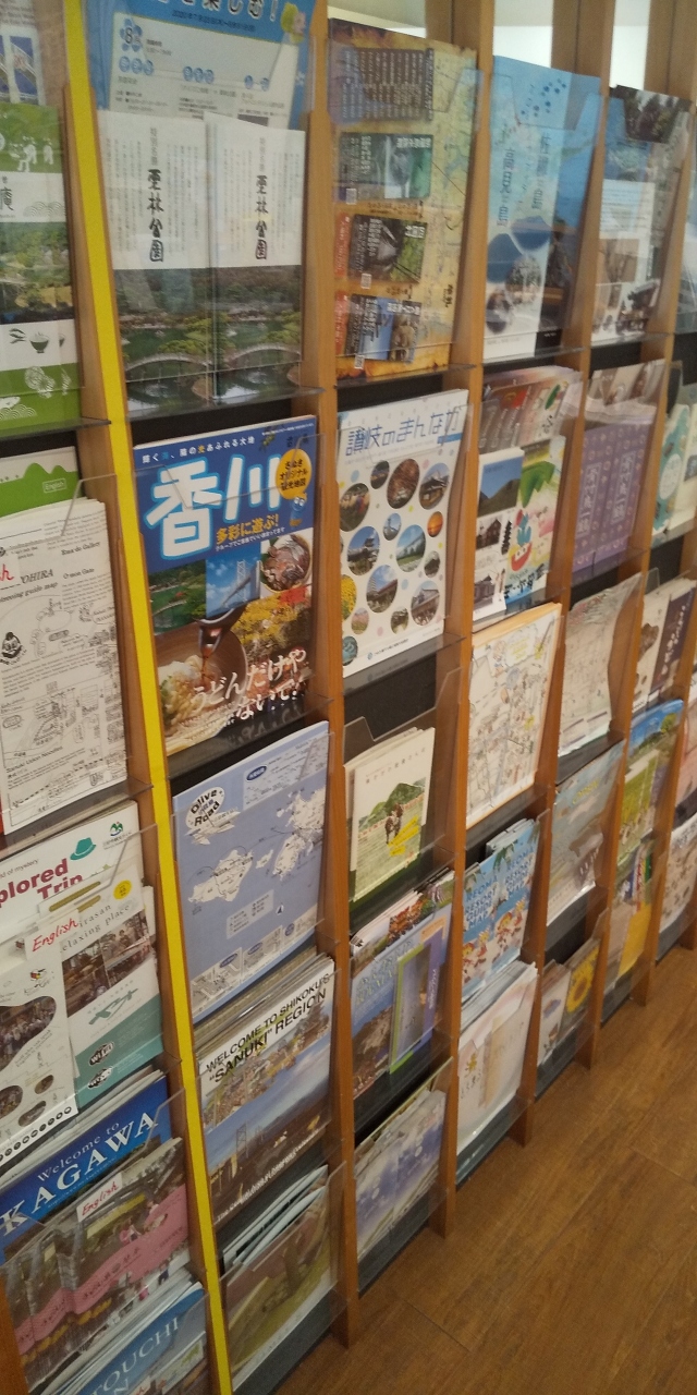 入り口がカフェになっていてご当地ソフトクリームが人気です。さらに奥が地図やパンフレット類がたくさん置かれた観光案内所です。琴平町だけでなく県全域にわたる資料提供があり、有人カウンターでの質問もできます。