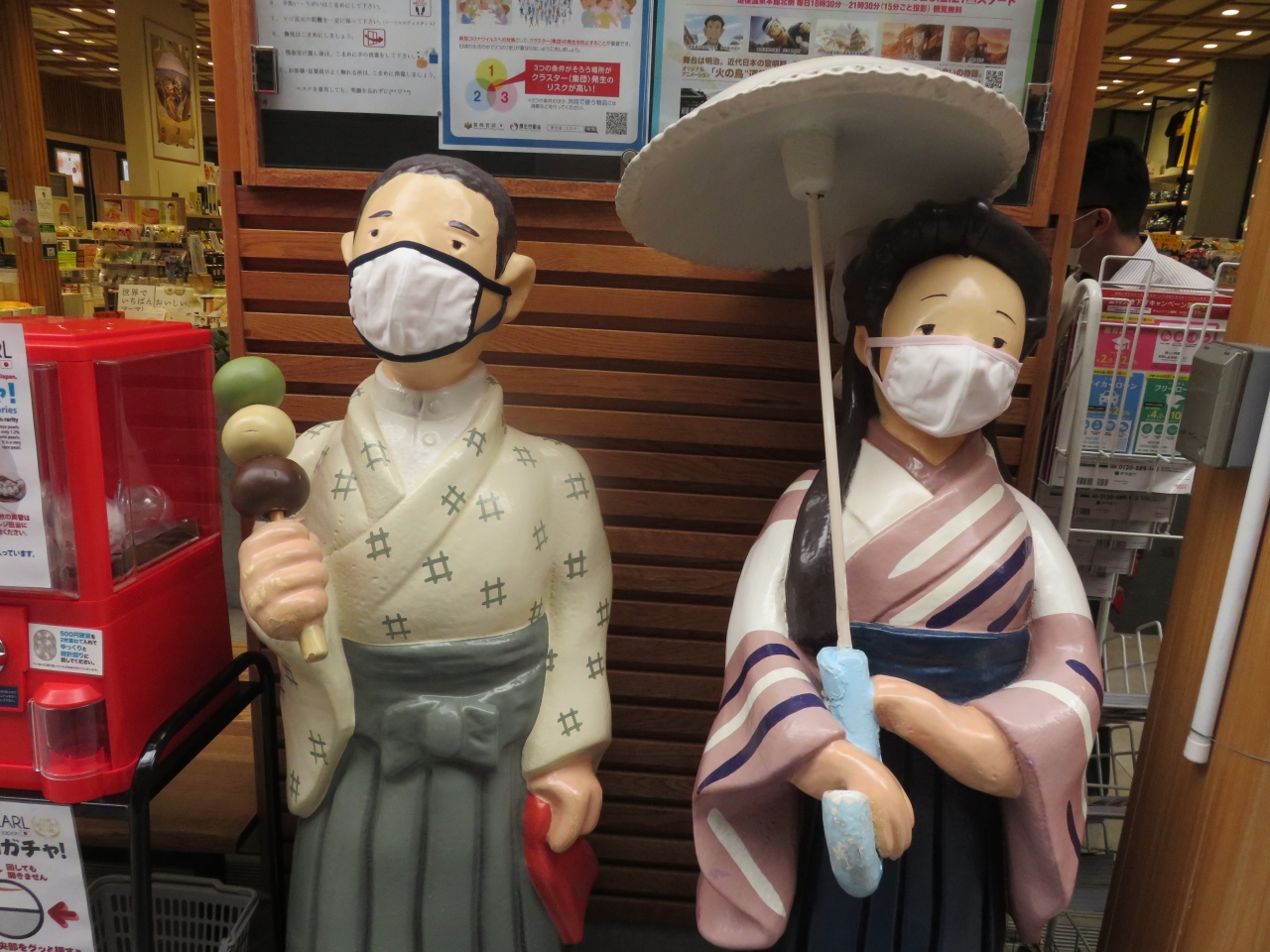 商店街の中にあるお土産屋さんなのですが、店先には坊ちゃんの人形が。人形もマスクをしていてちょっと足を止めてしまいました。お店もきれいで広い店内なので、定番のお菓子からみかんジュースなどをゆっくりと見て回ることができました。ほしいものがなくて見ているだけでも広いからよいのではないかと思いました。