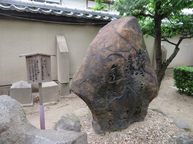 松尾芭蕉の句碑は、芭蕉が旅好きだったので、色々な場所にあります。こちらの句碑は、形が複雑な茶色っぽい岩に句が書いてますが、隣に看板がなかったら何が書いてあるかわかりません。「梅咲てよろこぶ鳥の気色かな」と書いてあります。本当に達筆です。