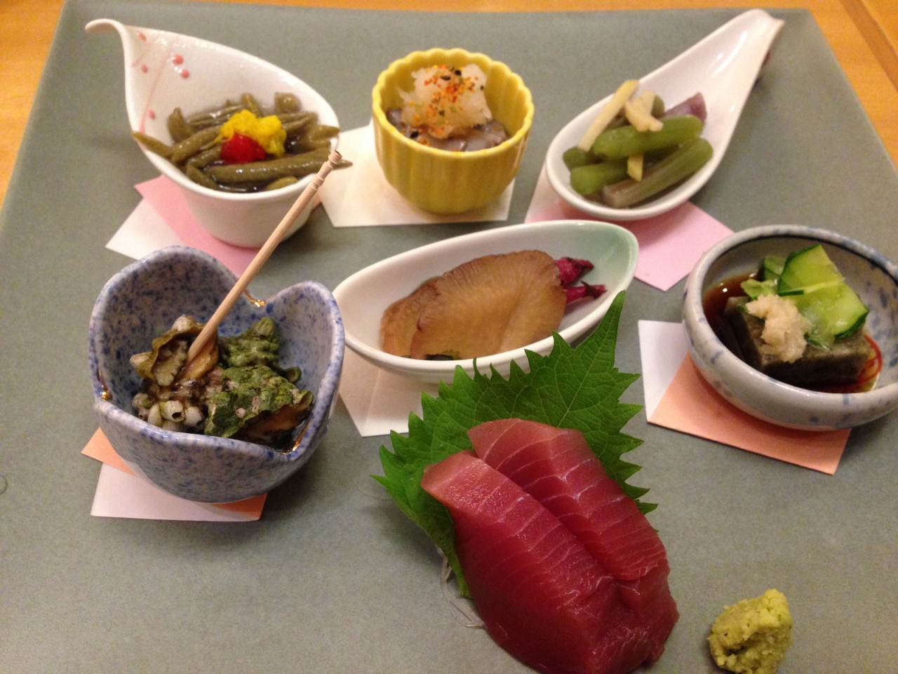 夕食で”ほろ酔いセット”を頂きました。生ビールと冷酒と一緒に色々な小鉢もの比内地鶏の焼き鳥串、最後に稲庭うどんが出てきました。うどんは生麺と乾麺が有ったのですが、生麺の冷いのを頂きモチモチで大満足でした。