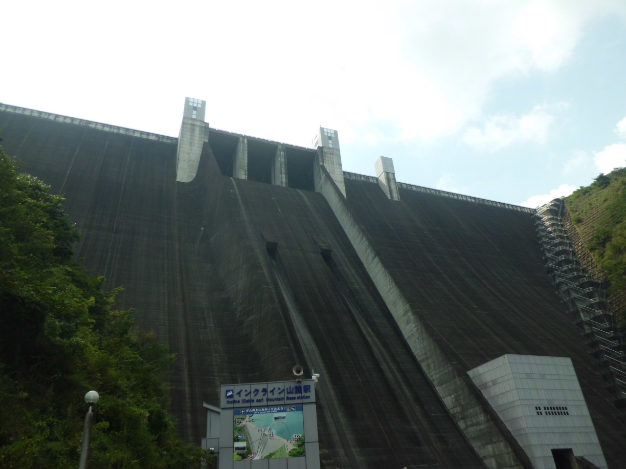 車で行かないと不便です。国道からの入り口が、案内もなくわかりづらいです。土日などは駐車場は有料で一日500円です。駐車場から15分くらい歩くとダムの下につきます。普段は全然放水していないようです。エレベーターは無料ですがコロナ対策で運休、インクラインでダムの上まで登れます。往復500円です。コロナ対策でいろいろな施設が休館でした。