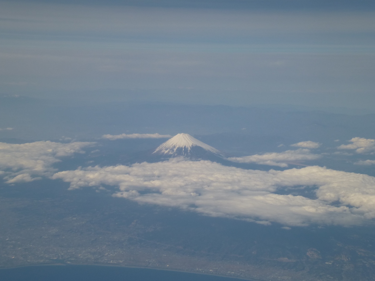 伊丹空港から成田空港に向かう国内線航空機の機内からも富士山が綺麗に見えました。機長がアナウンスをしてくれたのがありがたかったです。空から見る富士山はあまり記憶がなく、感動的な光景でした。飛行ルートによって変わるのかもしれませんが、この日はA席(機首に向かって左側の窓側席)が良かったようです。