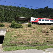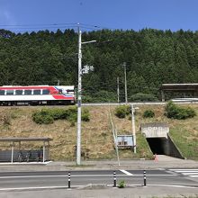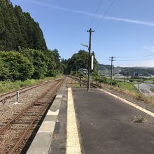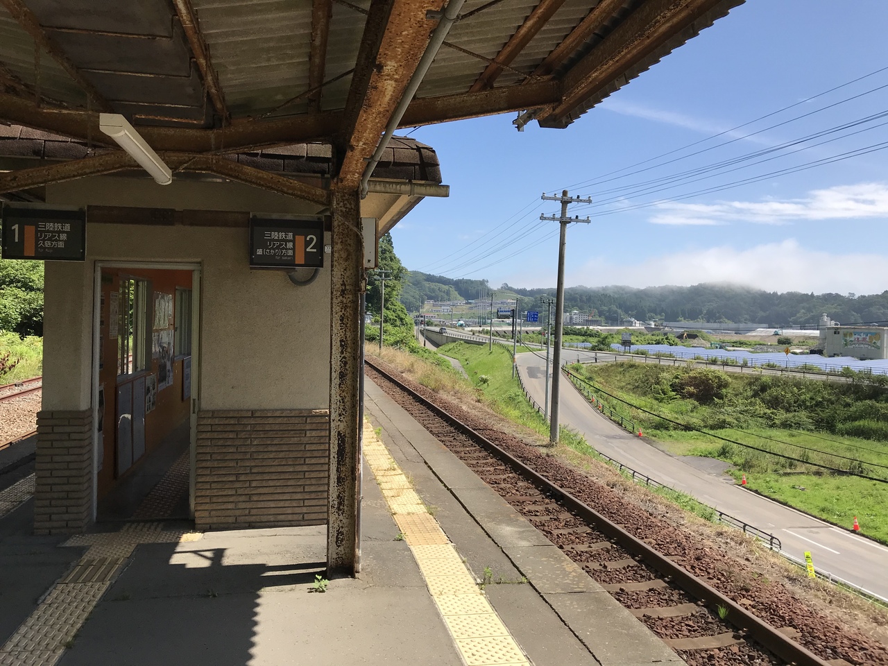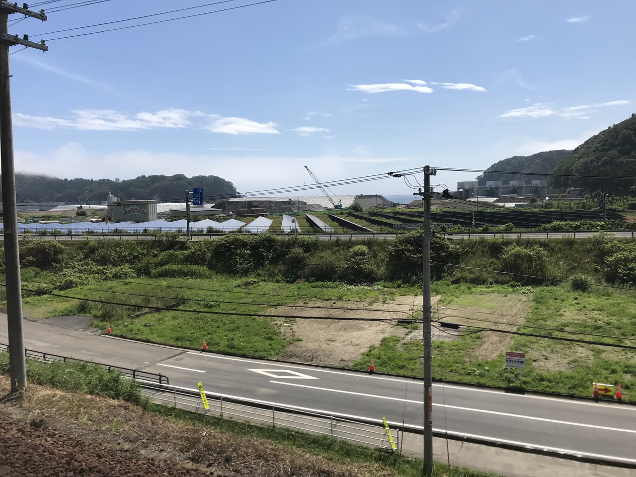 ホームからは田老港の高い防潮堤建設中で、未だに続く震災の復興作業の光景を垣間見た。