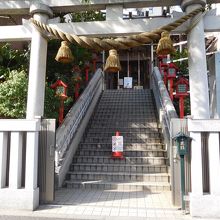 都営大江戸線の7番出口を出て、すぐ右側にある神社です。歩道からすぐの場所に鳥居と階段があり、階段を上ってお参りをしました。また、神社の右側には、「かえるさん」の石像が2つあり、左側には、港七福神の宝船の石像がありました。とてもコンパクトな印象の神社でしたが、駅に近くて便利な場所にある為か、結構、参拝者が多かったです。