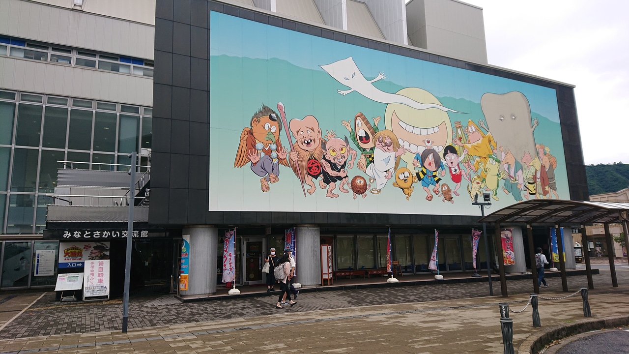 JR境港駅に隣接したフェリー乗り場、観光案内所、飲食店、売店、入浴施設などを持つ鳥取県の複合施設。2階には、人と妖怪をマンガで交流し、情報を発信する場である「境みなと・オアシス」という展示コーナーがあり、水木しげるさんや、名探偵コナンでお馴染みの青山剛昌さん、孤独のグルメの作画で有名な故谷口ジローさんを中心に、鳥取県出身のマンガ家や「まんが王国とっとり」について紹介。原稿をモチーフにしたオブジェや記念撮影コーナー、漫画作品もあります。個人的には、米子地元の怪人「ネギマン」がお気に入り。敵がお隣島根の「pi_・ジョー」というのも笑える。