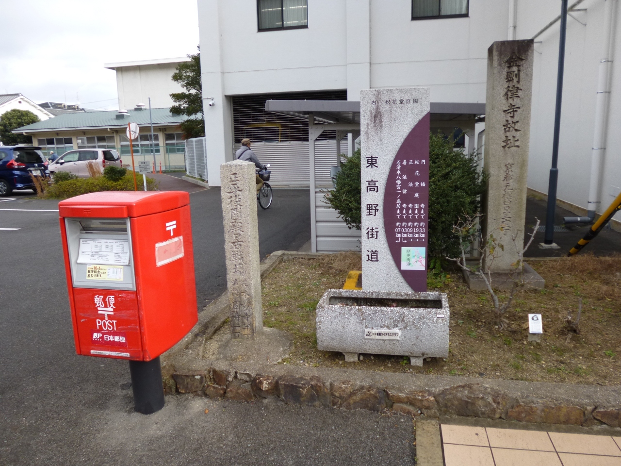 京都府八幡市立図書館の植え込みに史跡とともに「東高野街道」の表示があります。正確には図書館前の道から東に30メートルほどの場所を南北に貫くのが東高野街道になります。のどかな通り沿いには史跡や旧跡も多く、かつて多くの人々が行き来した痕跡が点在しており、散策が楽しいです。