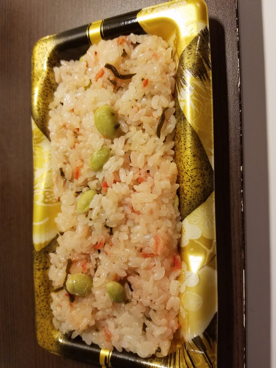 閉店1~2時間前に伺うと値引きされており、枝豆が入ったおこわを購入。