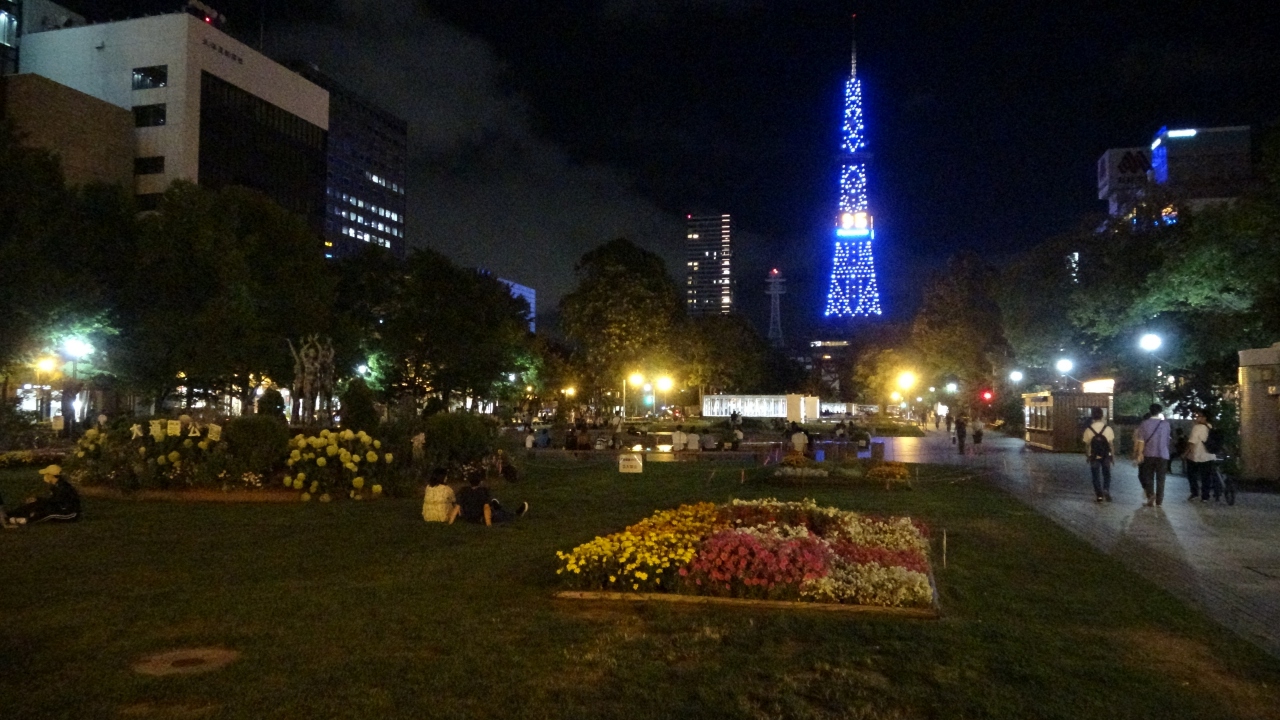夏本番ということもあり大通公園は夜でも多くの人で賑わっており、芝生に座っておしゃべりしたり都会のオアシスと夜のナイトビューを楽しむ人が結構いました。幸い晴れていたこともあり自分も今日1日の疲れを大通公園のベンチに座って、夜景と自然を楽しみながら過ごしました。