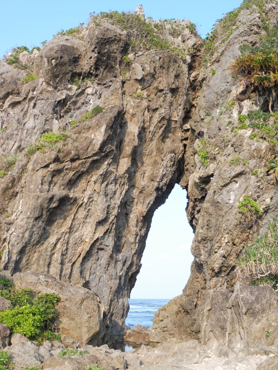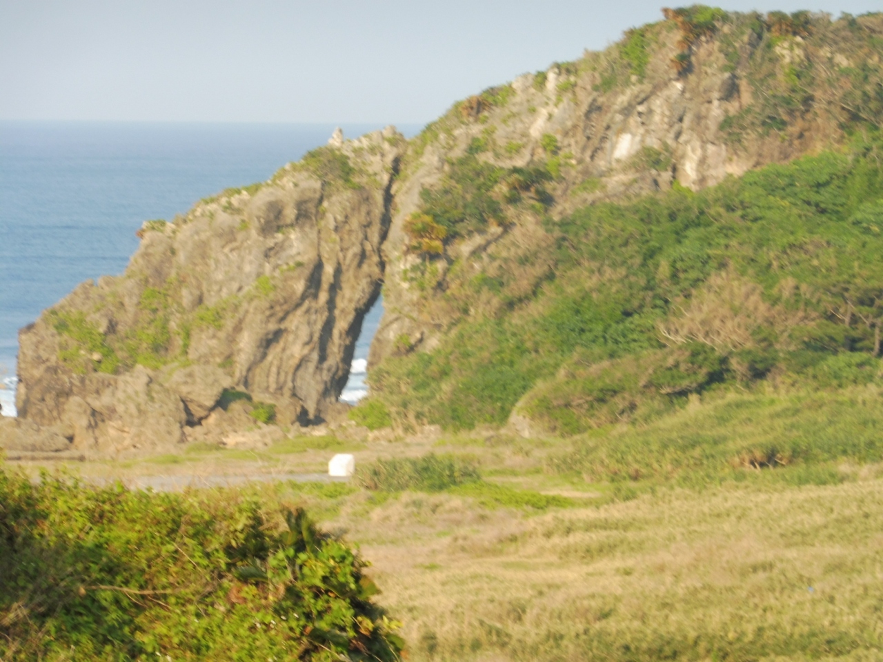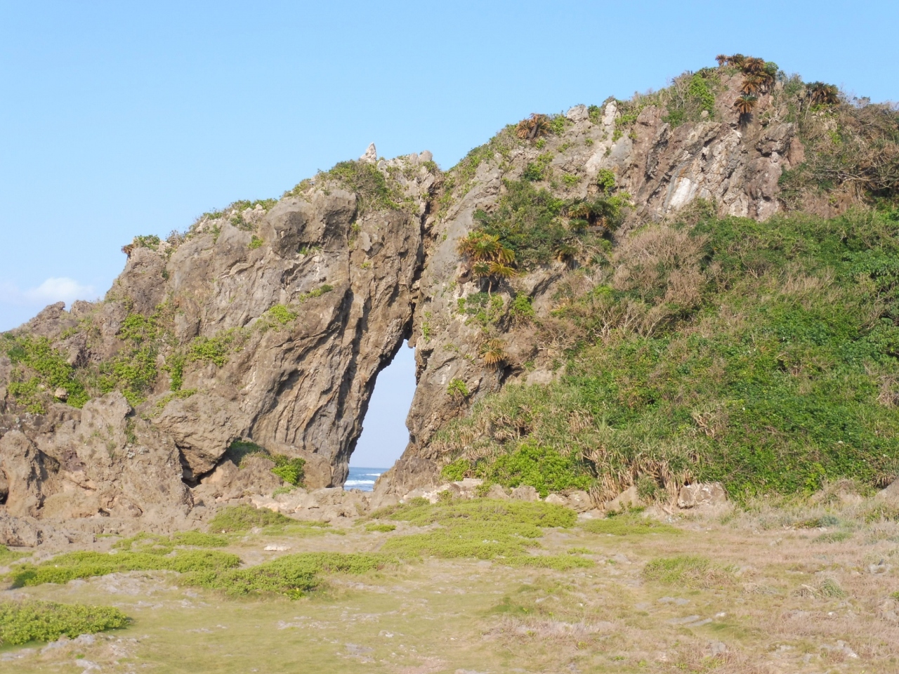 巨大な岸壁に大きな穴が開いている久米島を代表する景色です。