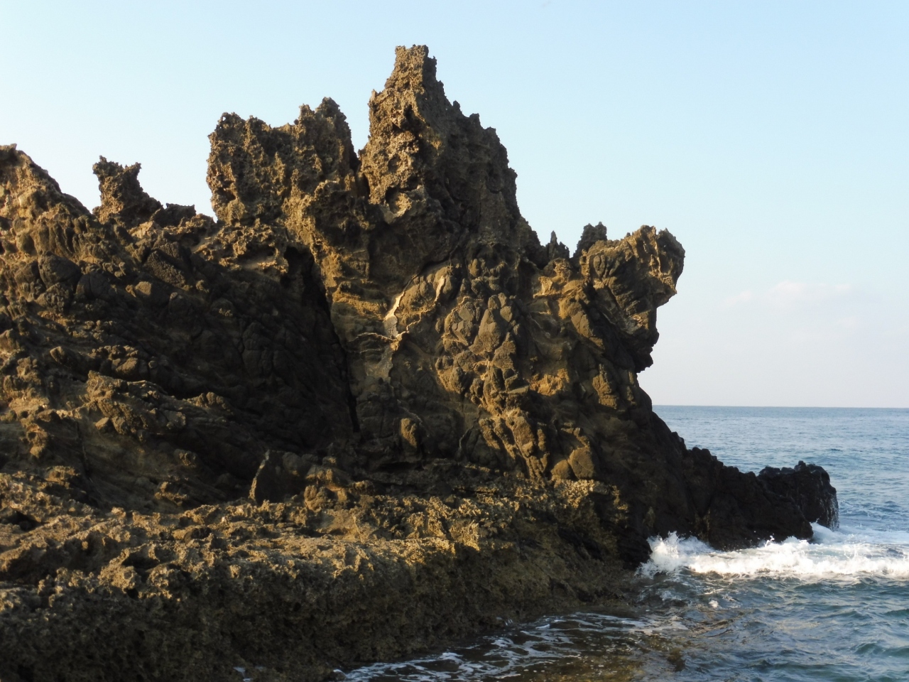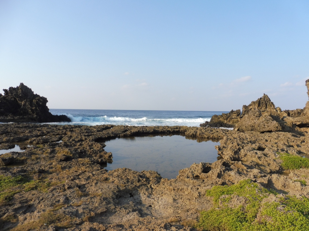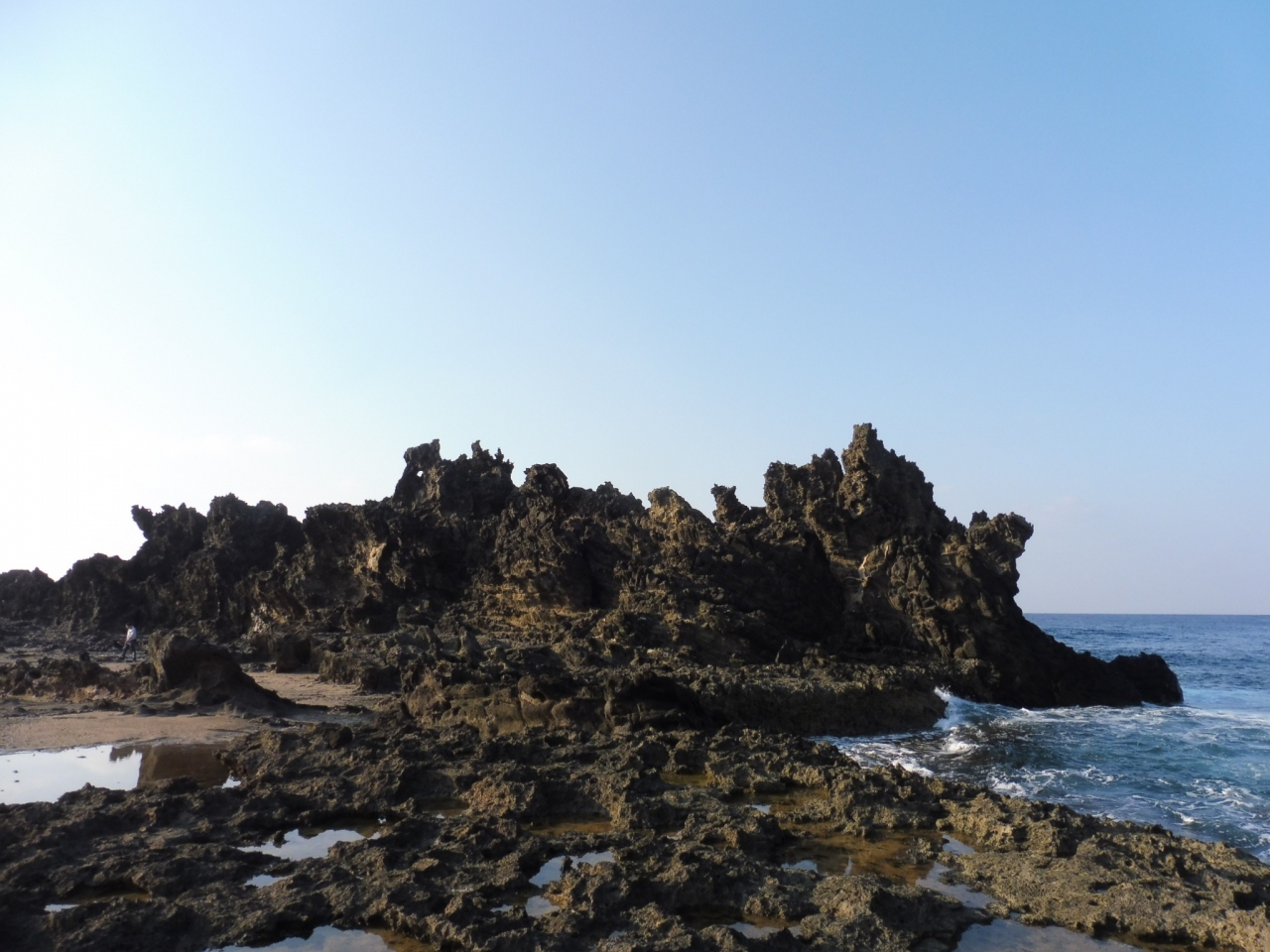 巨大な岸壁に大きな穴が開いている久米島を代表する景色です。