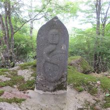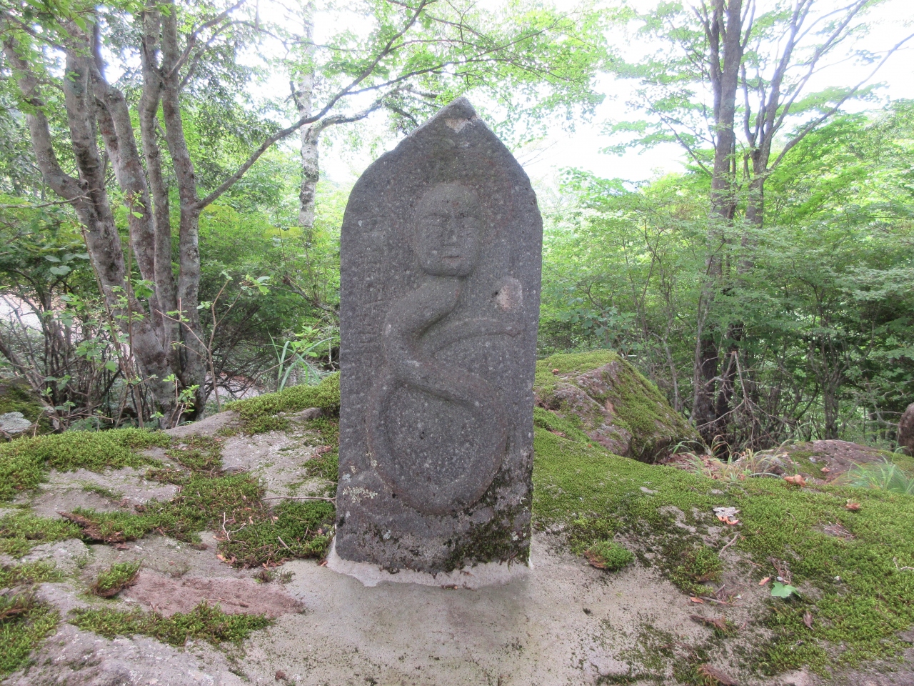 メルヘン街道の横谷観音入口バス停から5分ほど歩いたところに建つお堂に横谷聖観世音菩薩が祀られています。1937年に元陸軍中将市瀬が護国の霊地を築こうと発願して造られた2mほどの木造仏像です。白樺林に映える木造のお堂は1975年に建立されました。手前の石の上に人頭蛇神の宇賀神がありました。説明板に移設された訳などが記されていました。珍しい石仏に興味を持ちました。横谷観音にお参りした際に見ることをおすすめします。