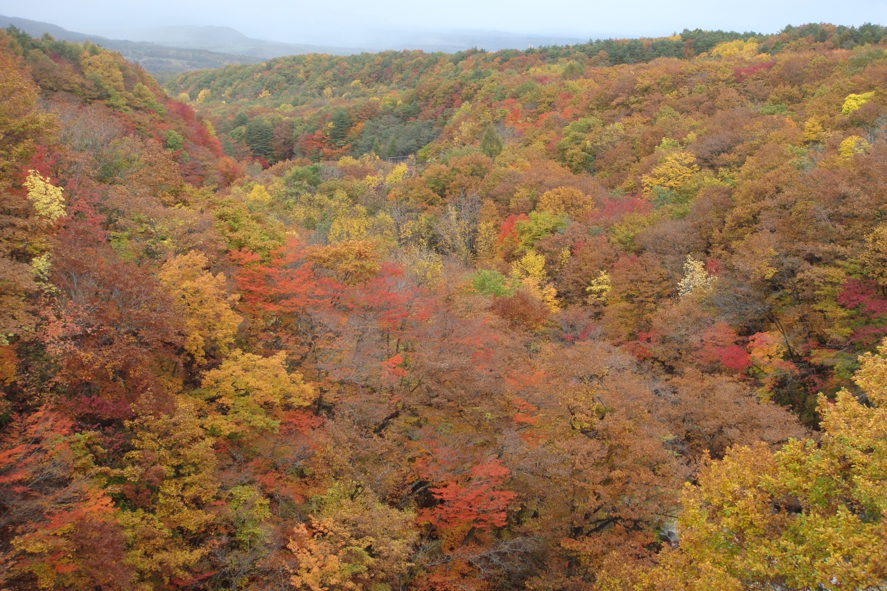 八幡平の観光を終えて、松川渓谷に架かるこの大橋まで来ました。橋の手前から道路の脇に停めている車が多いのに気づきました。やはり、紅葉のベストスポット。大橋の上には50人くらいの観光客が景色に見入って記念写真を撮っていました。橋の上から見る紅葉は下流側が最高。ずっと奥まで赤や黄色の紅葉が広がっています。青空ならもっと紅葉のコントラストが効いて色鮮やかに見えること間違いなし。旅行ガイド雑誌ではあまり紹介されていないので、穴場的紅葉スポットと言えます。