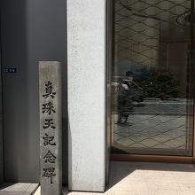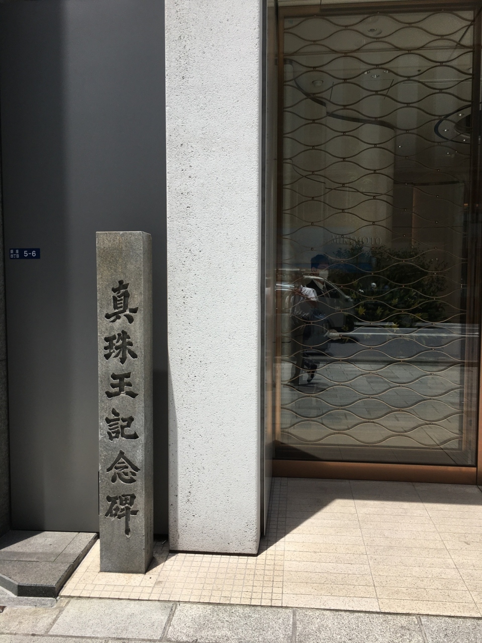 真珠で有名なミキモト本店の歩道脇にある記念碑です。ミキモトの創業者である御木本幸吉は1858年に三重県に生まれ、いろいろな職種に就いた後に真珠の養殖に着手しました。ついに1910年に真珠養殖に成功して世界中に売り出し、ビジネスとして大成功しました。彼の功績をたたえ本店があるこの地に石碑が建立されました。記念碑も真珠をモチーフにした珠型をしていればいいのに、地味に石柱でした。