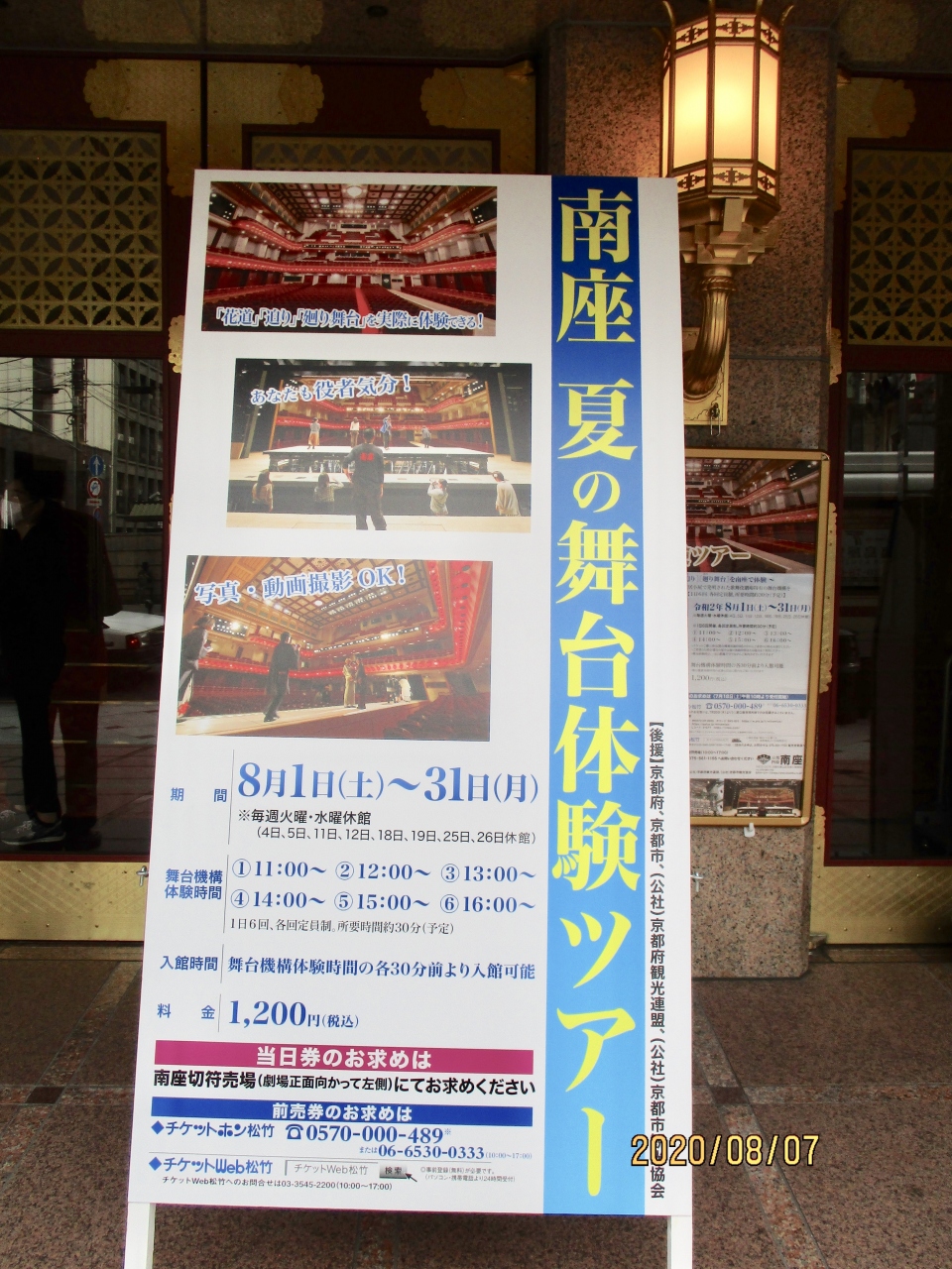 祇園周辺を歩いていたら、南座の夏の舞台体験ツアーを8月31日まで開催中というポスターを見つけて行ってみたのですが、残念ながら、満席で入ることができませんでした。電話かWEBで事前に予約をしていないと無理と言われました。