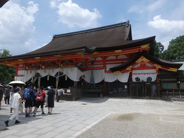 朱塗りも鮮やかな京都の八坂神社本殿です。昨年、祇園祭に出かけましたが、コロナ禍で多くの行事が中止になった今年、静かな夏を過ごしているんでしょうね。素人目の感じでは各地の大きな神社と同じように見えますが、本殿と拝殿を一つの屋根で覆う方式は珍しく「祇園造」と呼ばれているとか。国の重要文化財である現在の建物は1654年、4代将軍徳川家綱が建てたとのこと。家光から家綱の時代、京都で多くの神社仏閣が再建されたり新築されたりした印象があります。世の中が安定し、財力にも相当な余裕があったってことなのかしら。