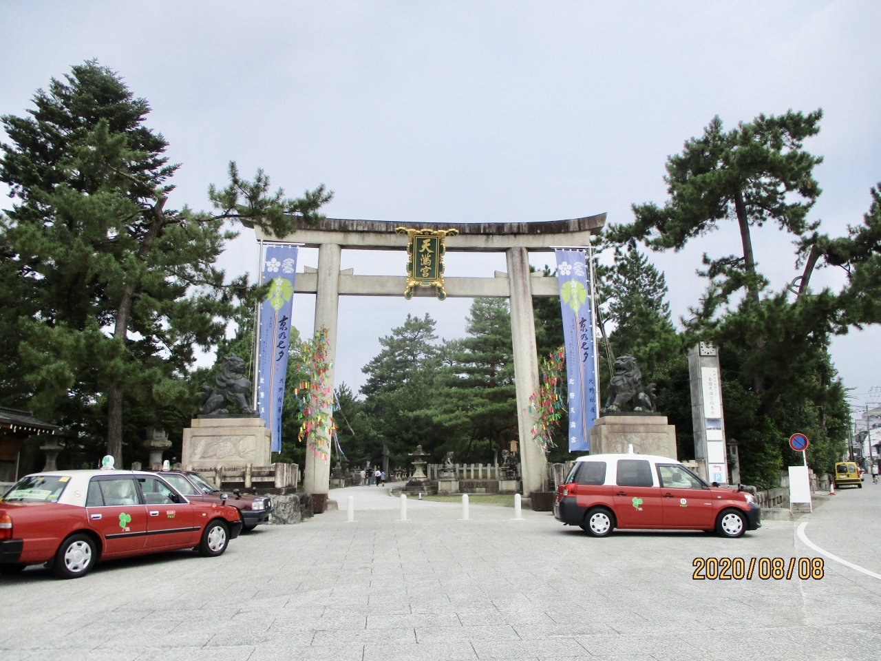 学問の神様として信仰されてきた菅原道眞が祀られている北野天満宮ですが、全国にある菅原道眞をお祀りした神社の総本山で、鳥居は3つあります。道路沿いには大変大きな『一の鳥居』があり、鳥居の前にはタクシーが数台止まっていました。