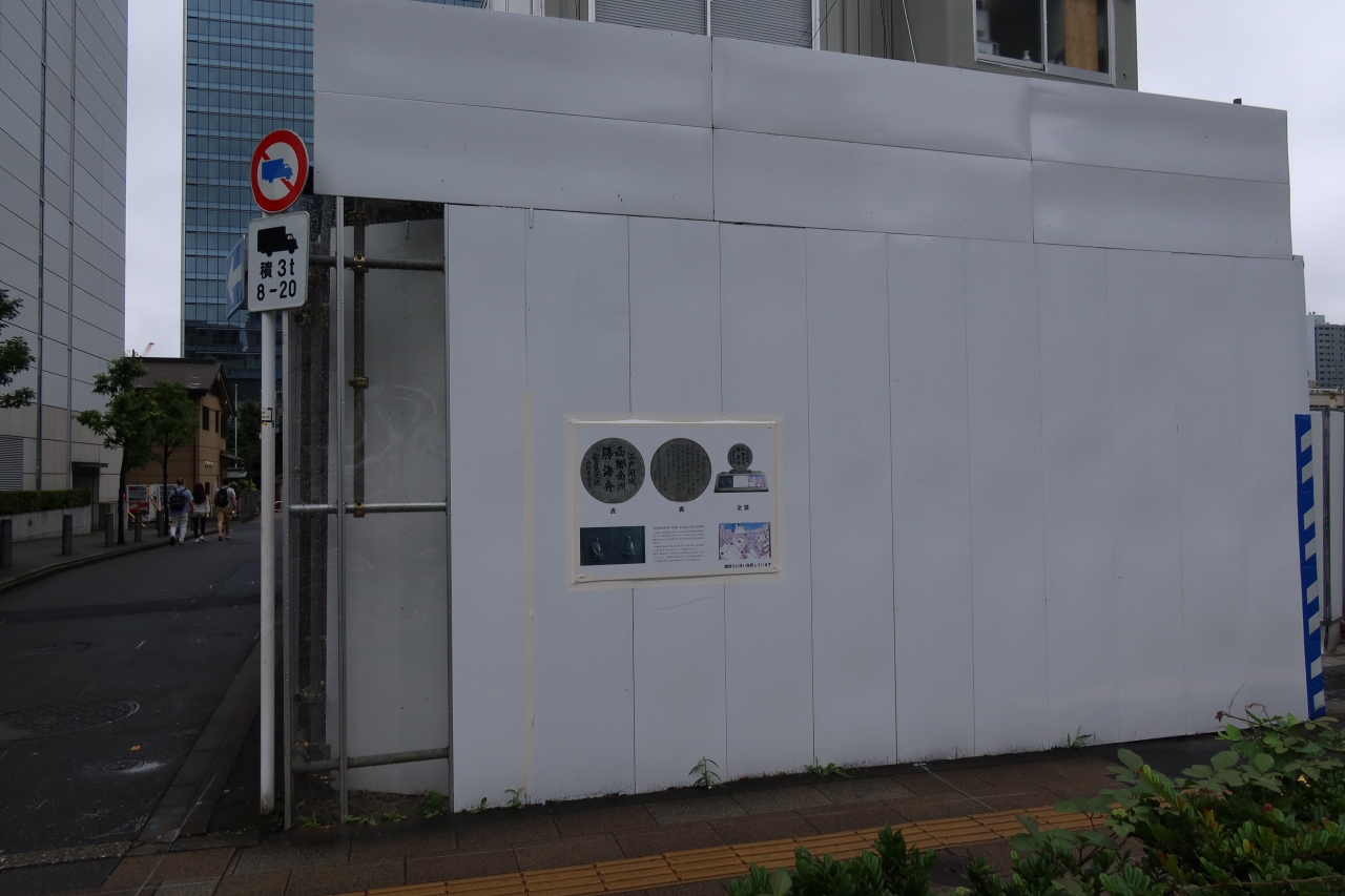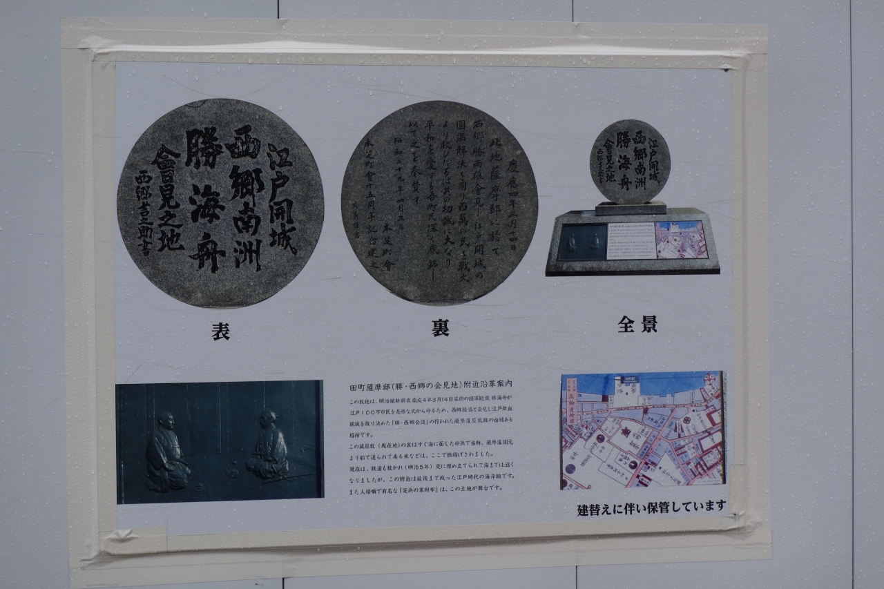 JR田町駅から第一京浜を浜松町方面に向かった芝5丁目交差点の近くにあった薩摩藩邸蔵屋敷で、江戸総攻撃の中止を決めた西郷隆盛と勝海舟が会見した地があります。以前訪れた時は丸い石碑があったのですが、今回訪れると工事中になっており、覆板に写真の入った説明札があるだけ。ちょっとがっかりでしたが、歴史的な地として見る価値があります。