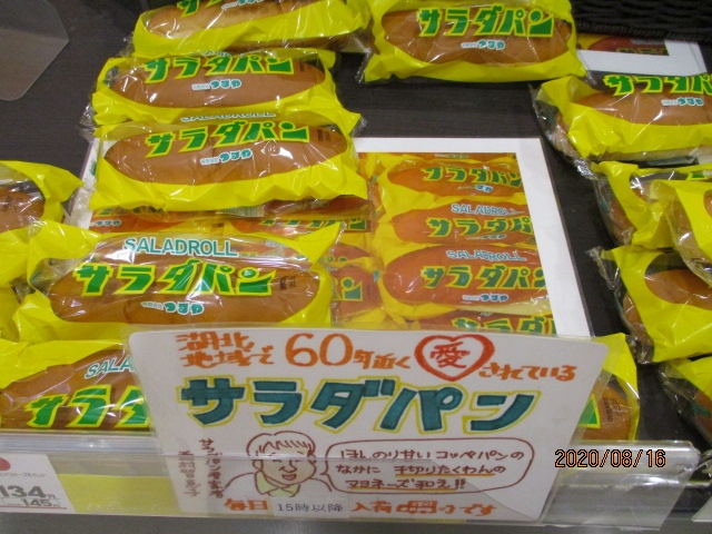 長浜駅直結のショッピングビル「モンデクール」の1階にフレンドマートがあります。スーパーマーケットです。こちらに長浜名物のつるやパンのパンが売られていました。サラダパン、サンドイッチ(魚肉ソーセージなどが入っている)、他にも数種類ありました。サラダパンがやはり一番多く入荷するようです。買えてよかったです。