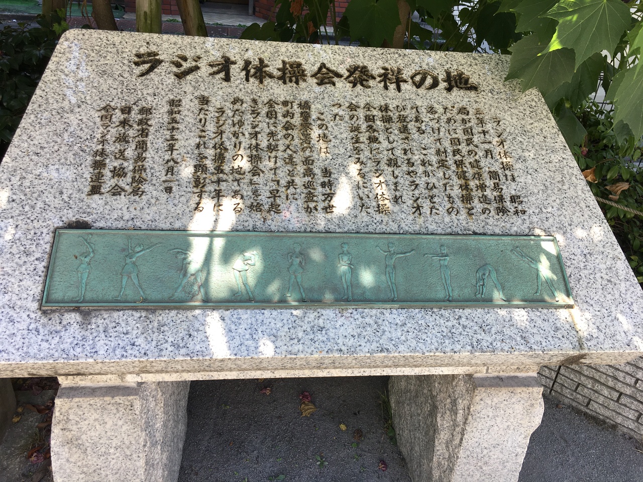 JR総武線秋葉原駅と浅草橋駅のほぼ中間地点にある佐久間公園内にこちらの石碑がありました。石碑にはラジオ体操の各動作を現したレリーフと、その由来が刻まれていました。文京区大塚にある大塚公園にも同様の石碑がありましたが、東京に限らずラジオの音声が届く全国で同様に始まったのですから、発祥した場所の1つということなんでしょう。