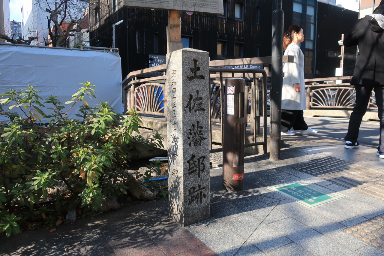 御池から四条までの木屋町通り沿いは風雲急を告げる幕末の舞台がずらりと並んでおり、その位置を示す石碑が林立している。この「土佐藩邸跡」もその一つだ。往時は坂本竜馬や武智半平太が出入りしたのだろう。近くには竜馬や半平太らの寓居跡を示す石碑がやはり並ぶ。幕末ファンにとってはぞくぞくするような場所だ。