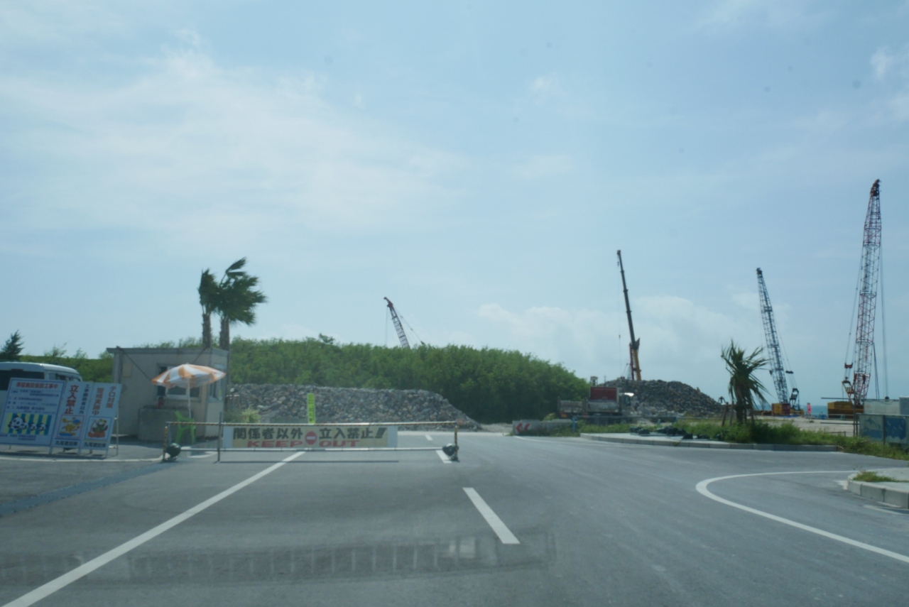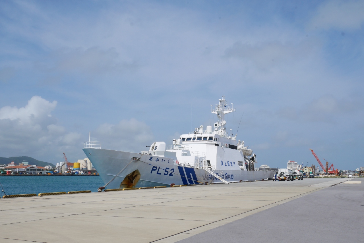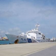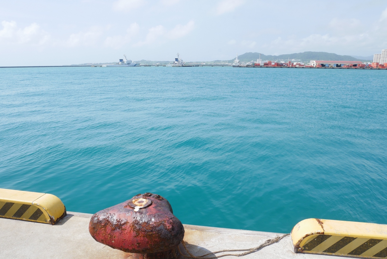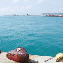 石垣港、離島ターミナルの対岸先に見えるブルーの橋がサザンゲートブリッジ