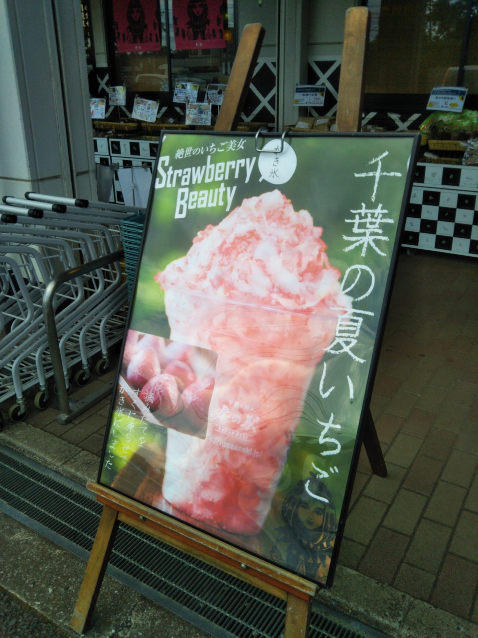 そんななか「千葉の夏いちご」の看板が目に付きました。千葉県産のいちごを使用した果実感あるかき氷の販売を始めたようです。暑い夏の日にうってつけのスイーツです。