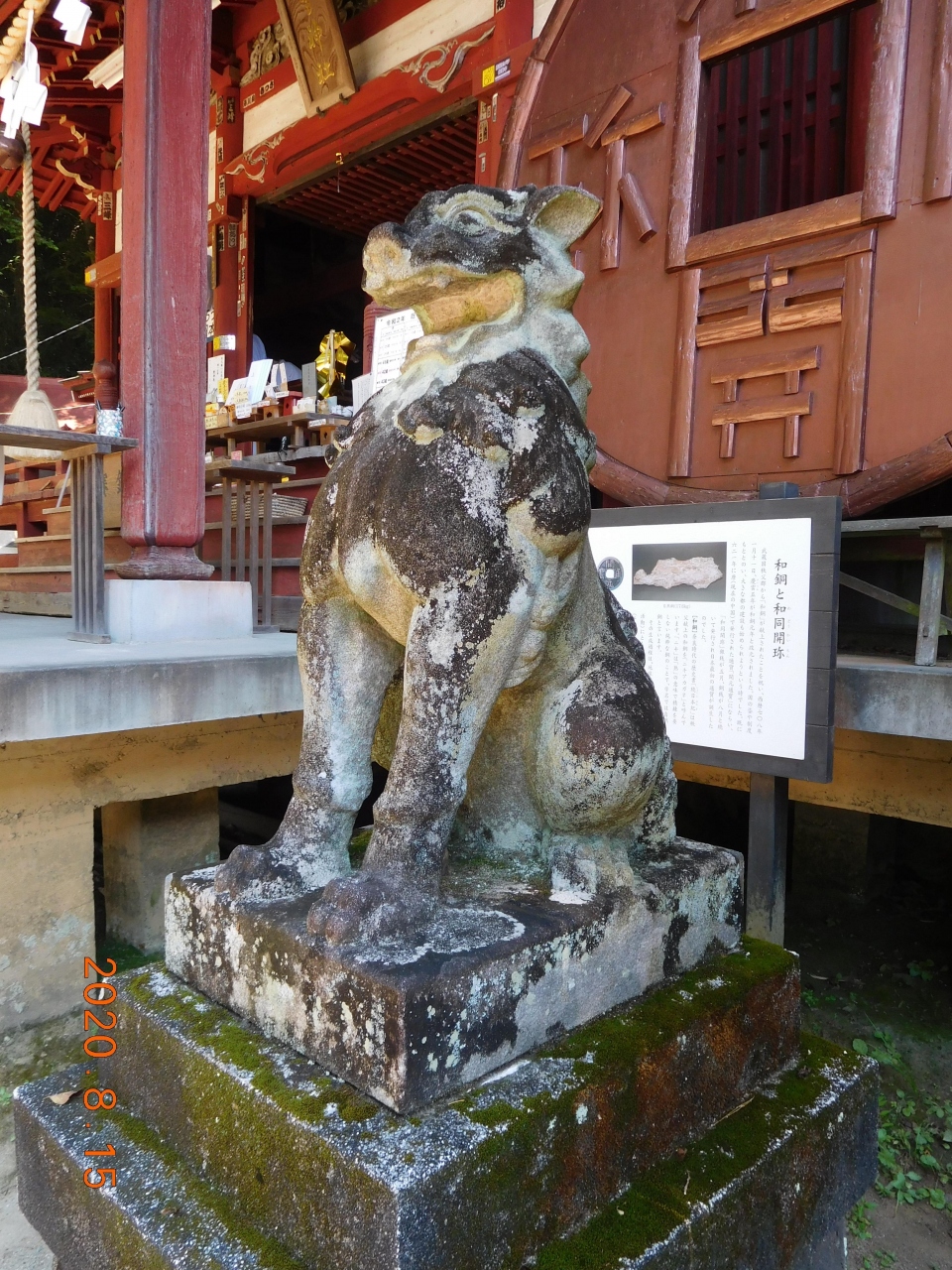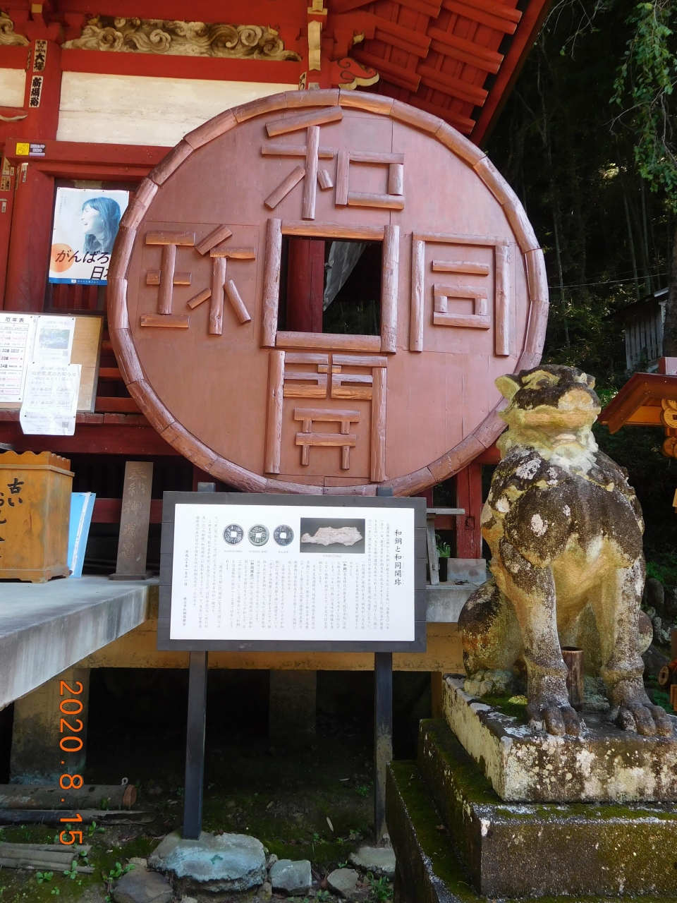 本殿の脇に大きな和同開珎があり、銭神さま感がステキです。