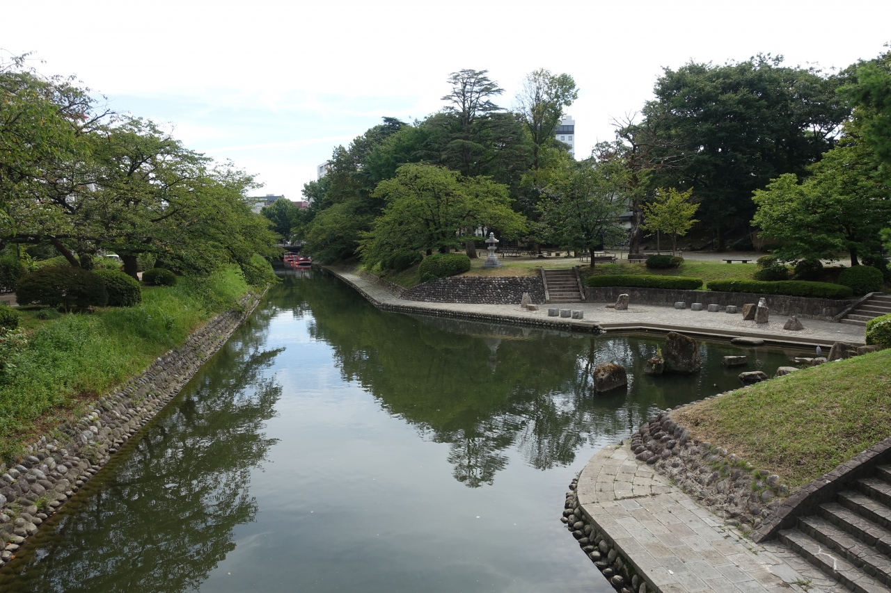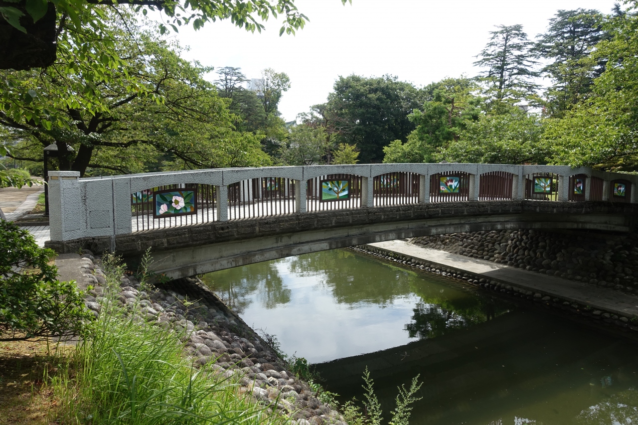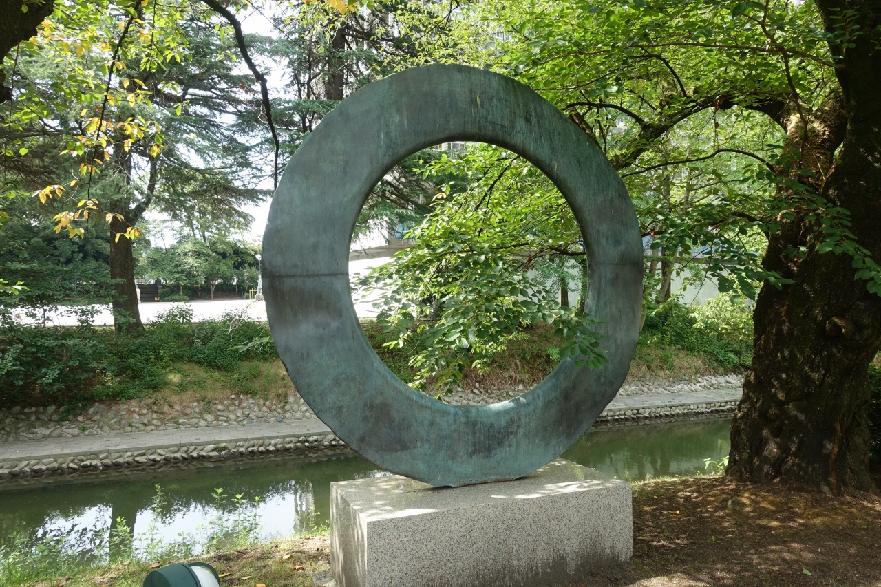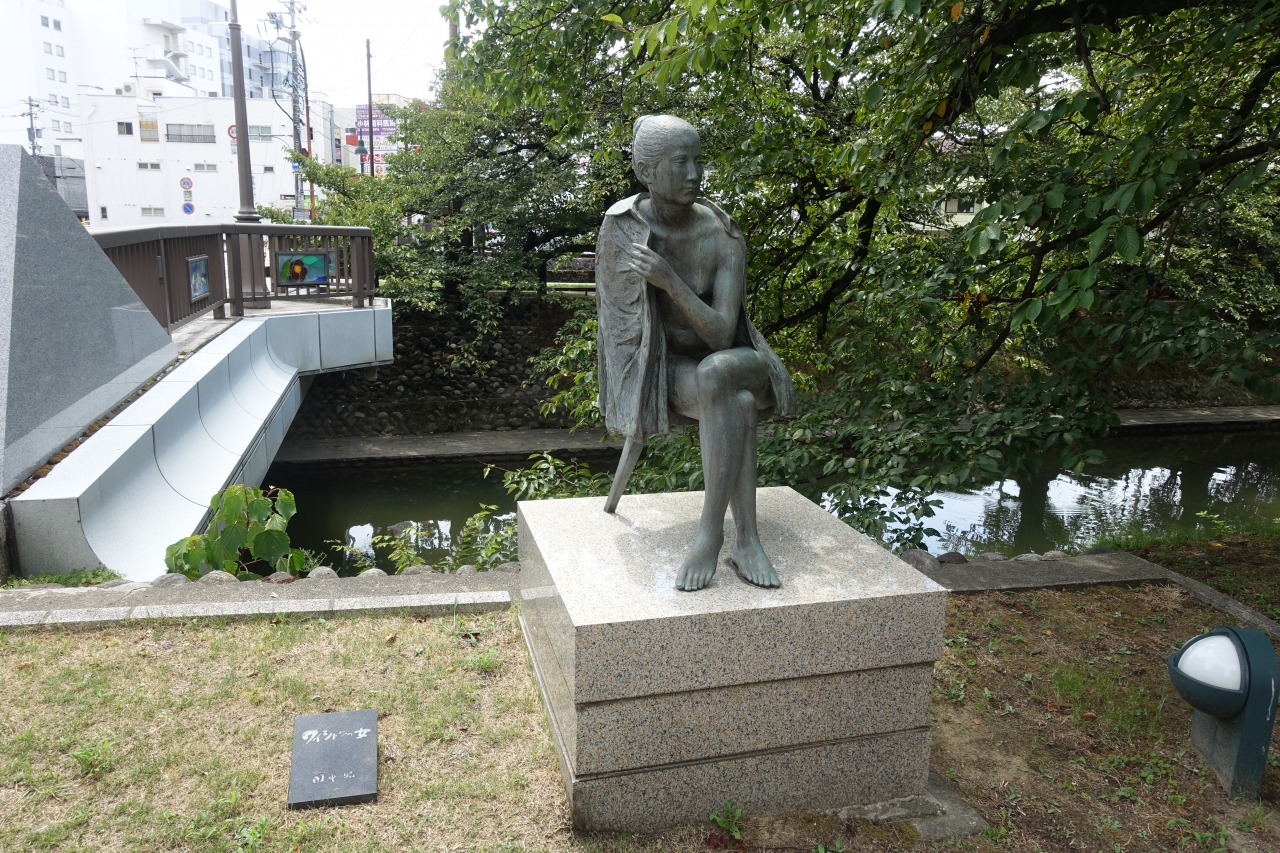 全部を歩くのは大変なので安住橋から桜橋にかけてを散策。所々に彫刻作品が設置されています。川岸の一部では歩道からさらに川の近くまで下りられ、川面を近くに感じられました。南側はそのまま富山城址公園につながっています。
